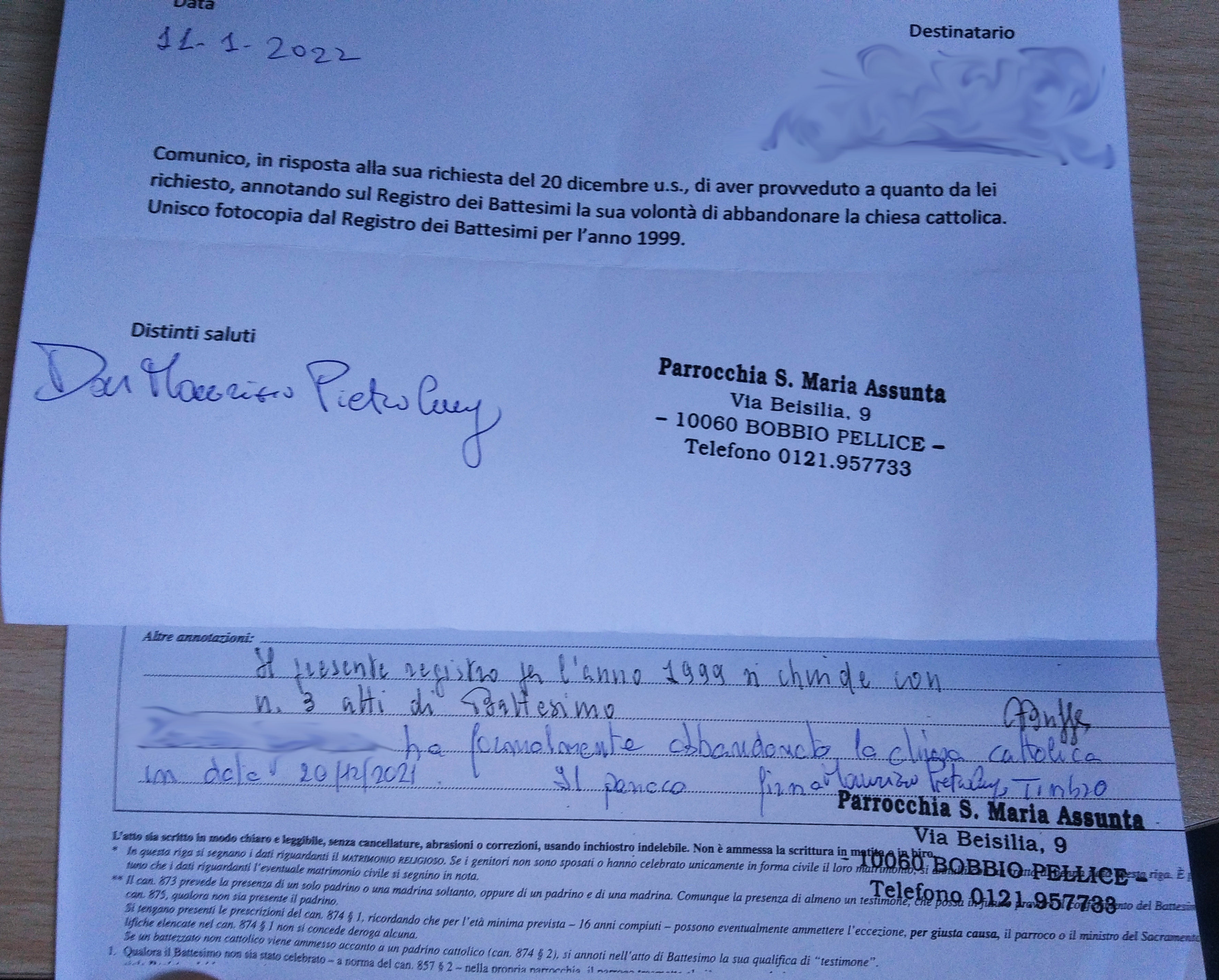 Una persona ha chiesto la rettifica dei dati relativi al proprio battesimo avvenuto a S. Maria Assunta - BOBBIO PELLICE (TO) il 11/01/2022, dichiarando di non voler più far parte della Chiesa Cattolica.