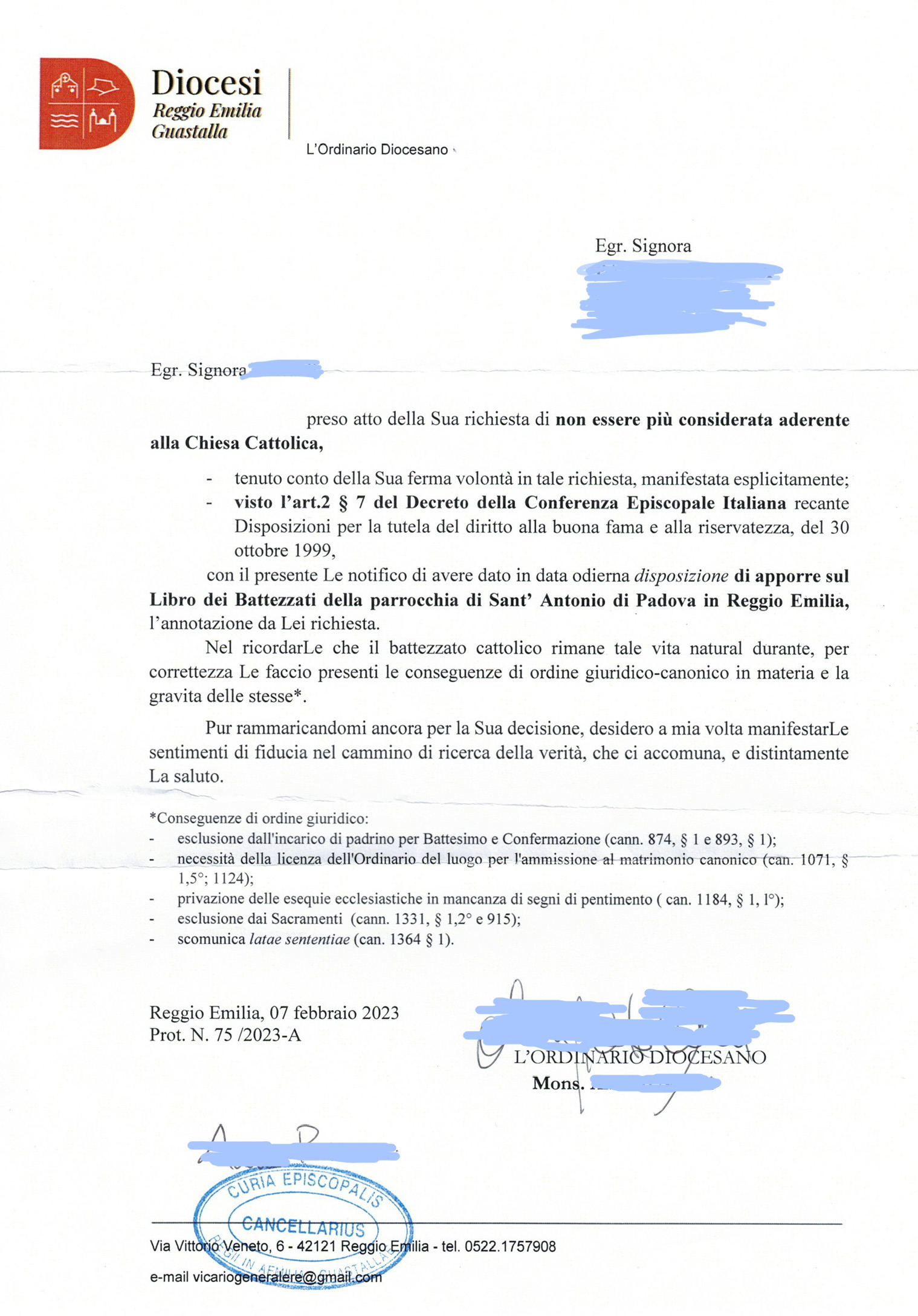 Una persona ha chiesto la rettifica dei dati relativi al proprio battesimo avvenuto a S. Antonio di Padova C. e D. - REGGIO NELL'EMILIA (RE) il 15/02/2023, dichiarando di non voler più far parte della Chiesa Cattolica.