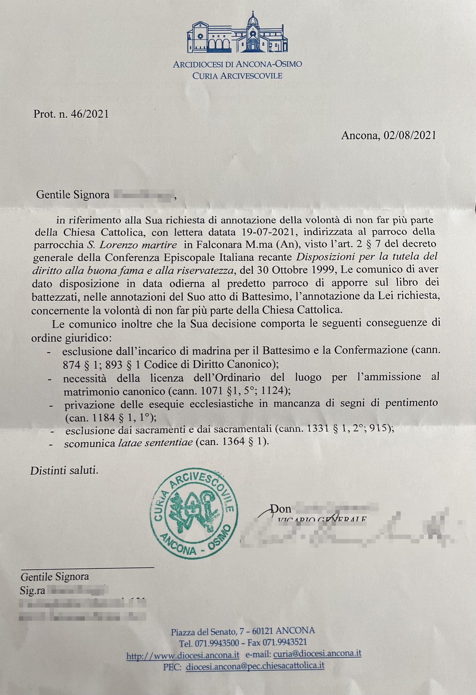 Una persona ha chiesto la rettifica dei dati relativi al proprio battesimo avvenuto a S. Lorenzo - FALCONARA MARITTIMA (AN) il 02/08/2021, dichiarando di non voler più far parte della Chiesa Cattolica.