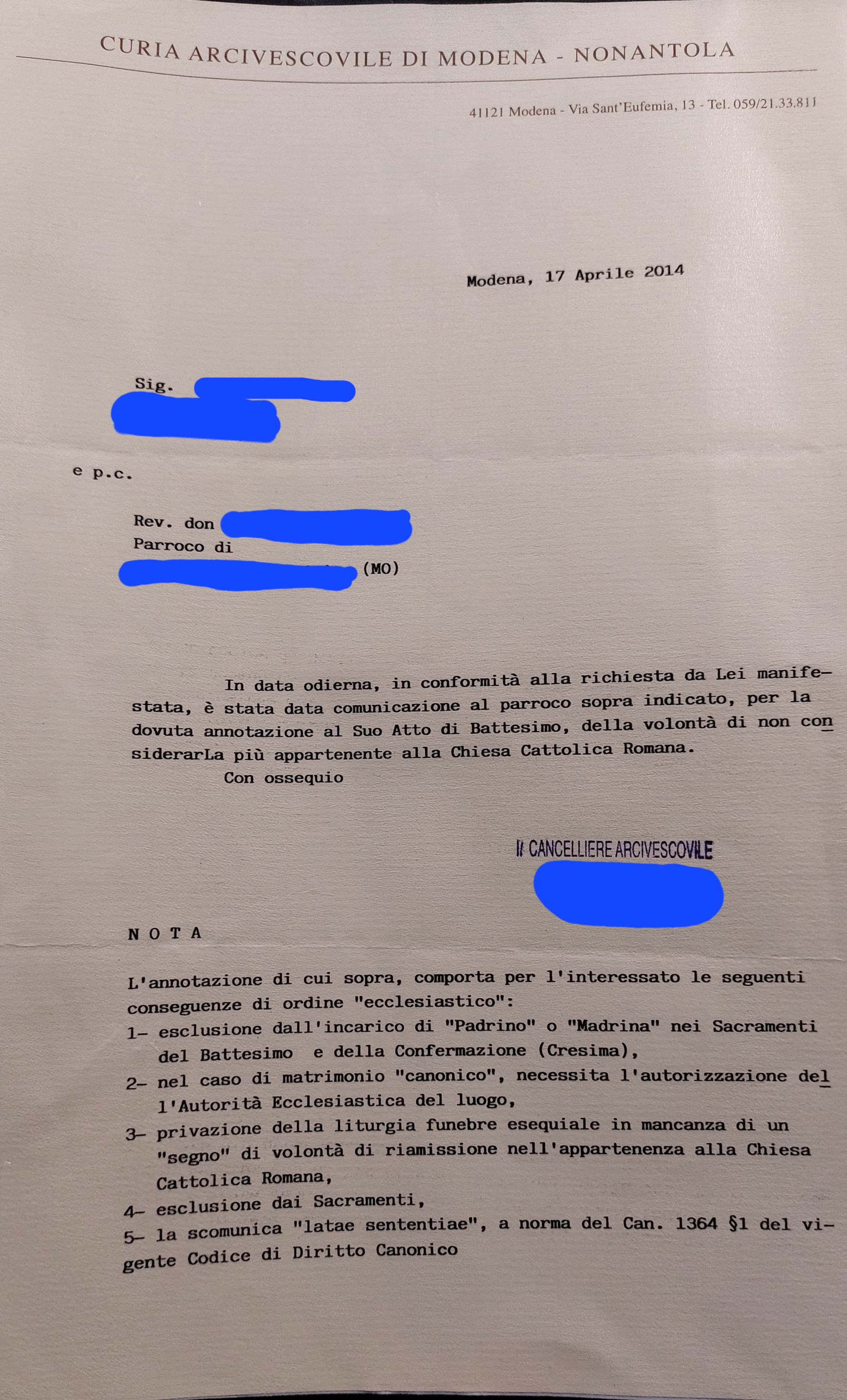 Una persona ha chiesto la rettifica dei dati relativi al proprio battesimo avvenuto a S. Giacomo Maggiore - FORMIGINE (MO) il 17/04/2014, dichiarando di non voler più far parte della Chiesa Cattolica.