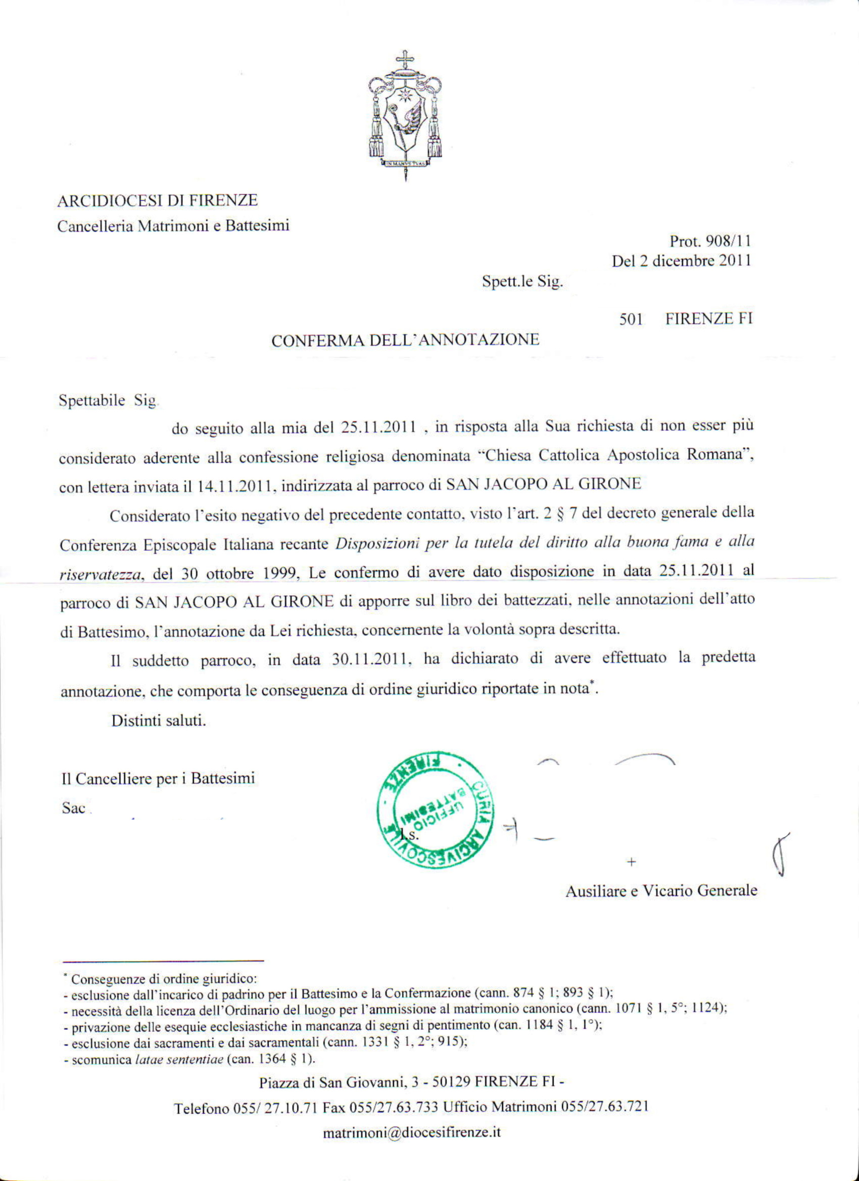 Una persona ha chiesto la rettifica dei dati relativi al proprio battesimo avvenuto a S. Jacopo al Girone - FIESOLE (FI) il 03/12/2011, dichiarando di non voler più far parte della Chiesa Cattolica.