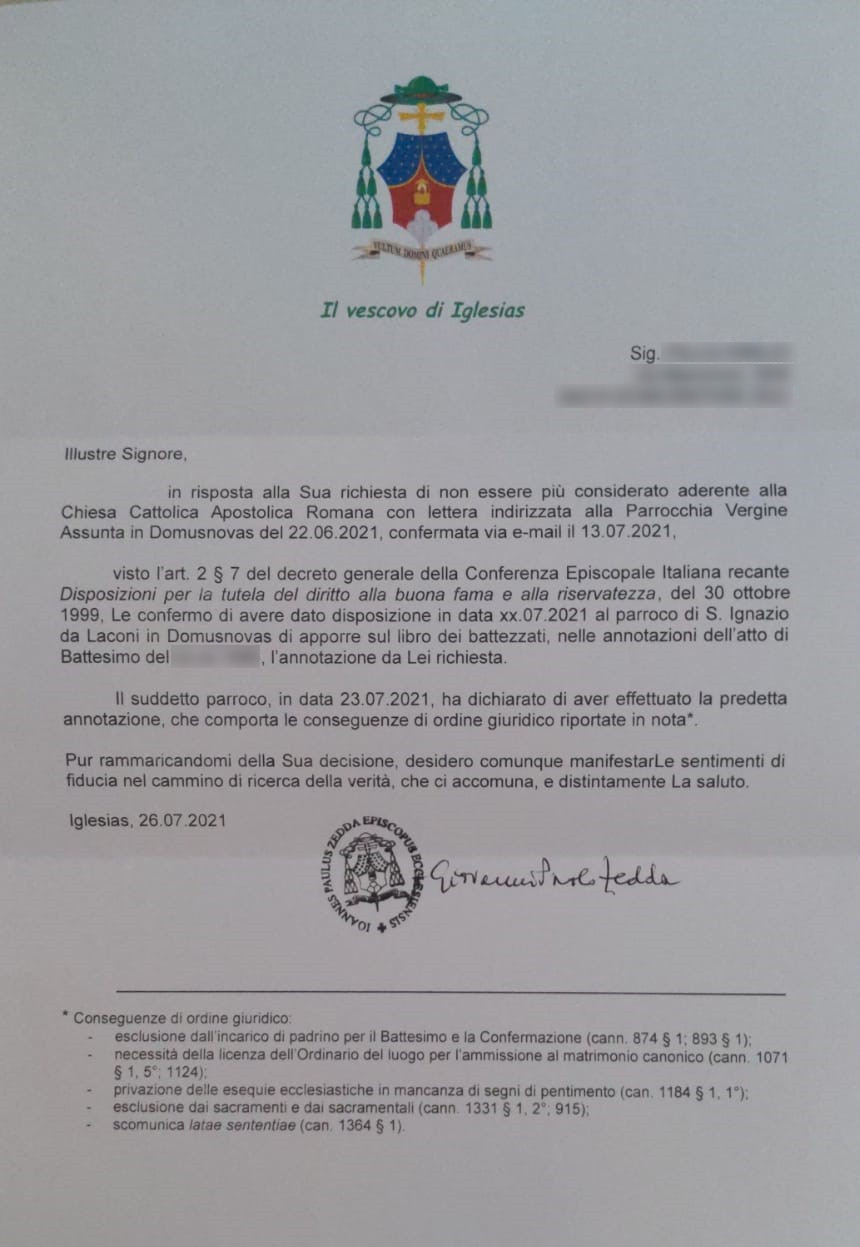 Una persona ha chiesto la rettifica dei dati relativi al proprio battesimo avvenuto a Vergine Assunta - DOMUSNOVAS (SU) il 27/07/2021, dichiarando di non voler più far parte della Chiesa Cattolica.