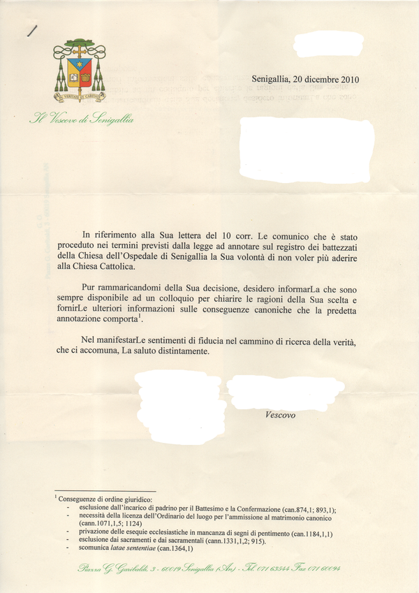 Una persona ha chiesto la rettifica dei dati relativi al proprio battesimo avvenuto a Chiesa dell'Ospedale - SENIGALLIA (AN) il 20/12/2010, dichiarando di non voler più far parte della Chiesa Cattolica.