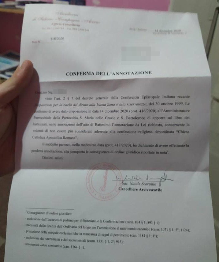 Una persona ha chiesto la rettifica dei dati relativi al proprio battesimo avvenuto a S. Maria Delle Grazie e S. Bartolomeo - SALERNO (SA) il 23/12/2020, dichiarando di non voler più far parte della Chiesa Cattolica.