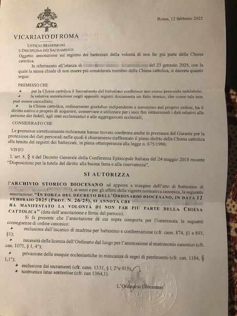 Una persona ha chiesto la rettifica dei dati relativi al proprio battesimo avvenuto a San Paolo fuori le mura - ROMA (RM) il 12/02/2025, dichiarando di non voler più far parte della Chiesa Cattolica.