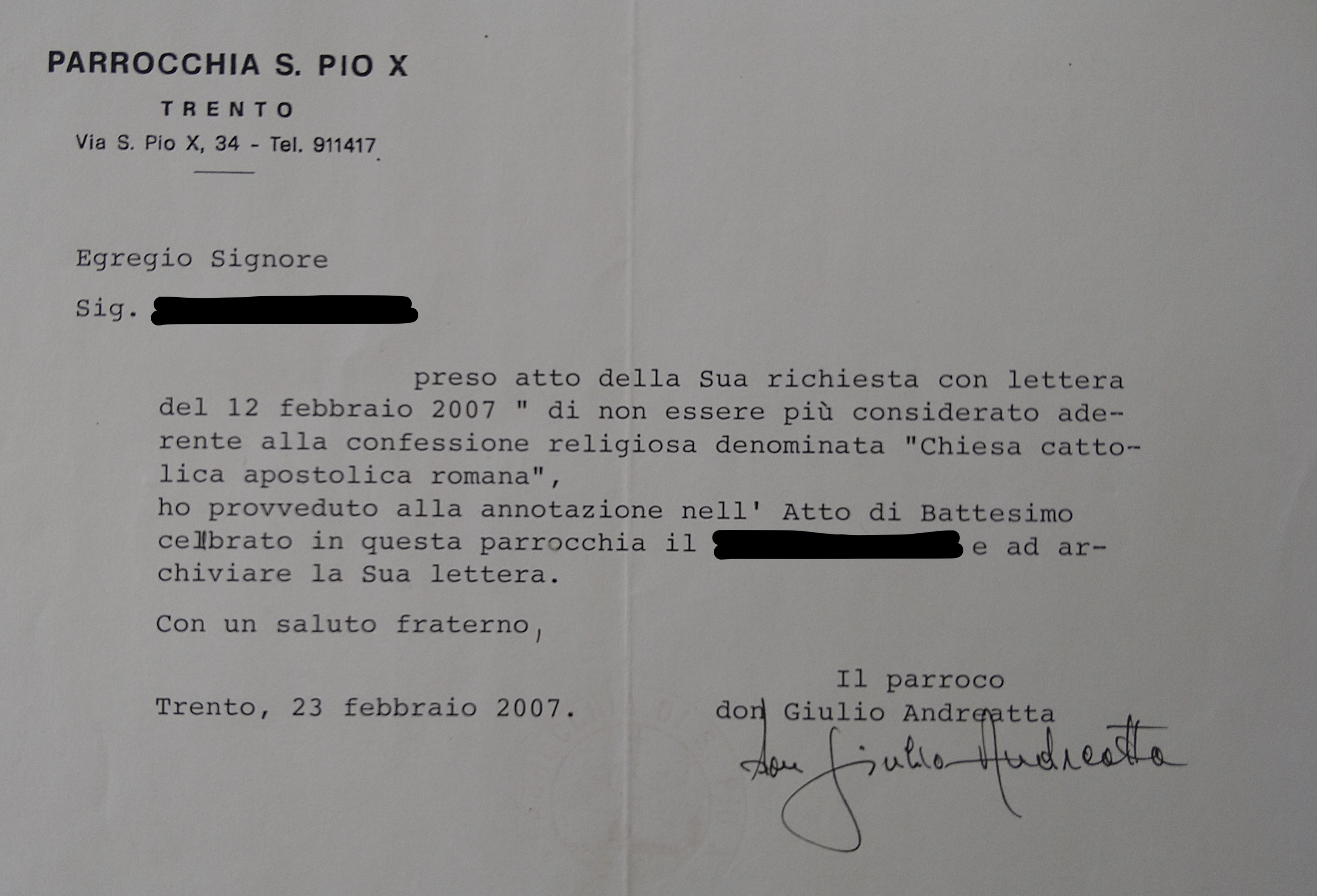 Una persona ha chiesto la rettifica dei dati relativi al proprio battesimo avvenuto a San Pio X - TRENTO (TN) il 23/02/2007, dichiarando di non voler più far parte della Chiesa Cattolica.