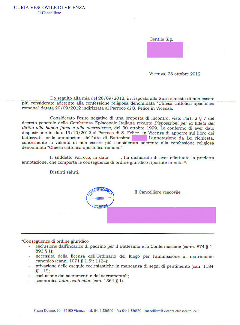 Una persona ha chiesto la rettifica dei dati relativi al proprio battesimo avvenuto a Ss. Felice e Fortunato - VICENZA (VI) il 23/10/2012, dichiarando di non voler più far parte della Chiesa Cattolica.