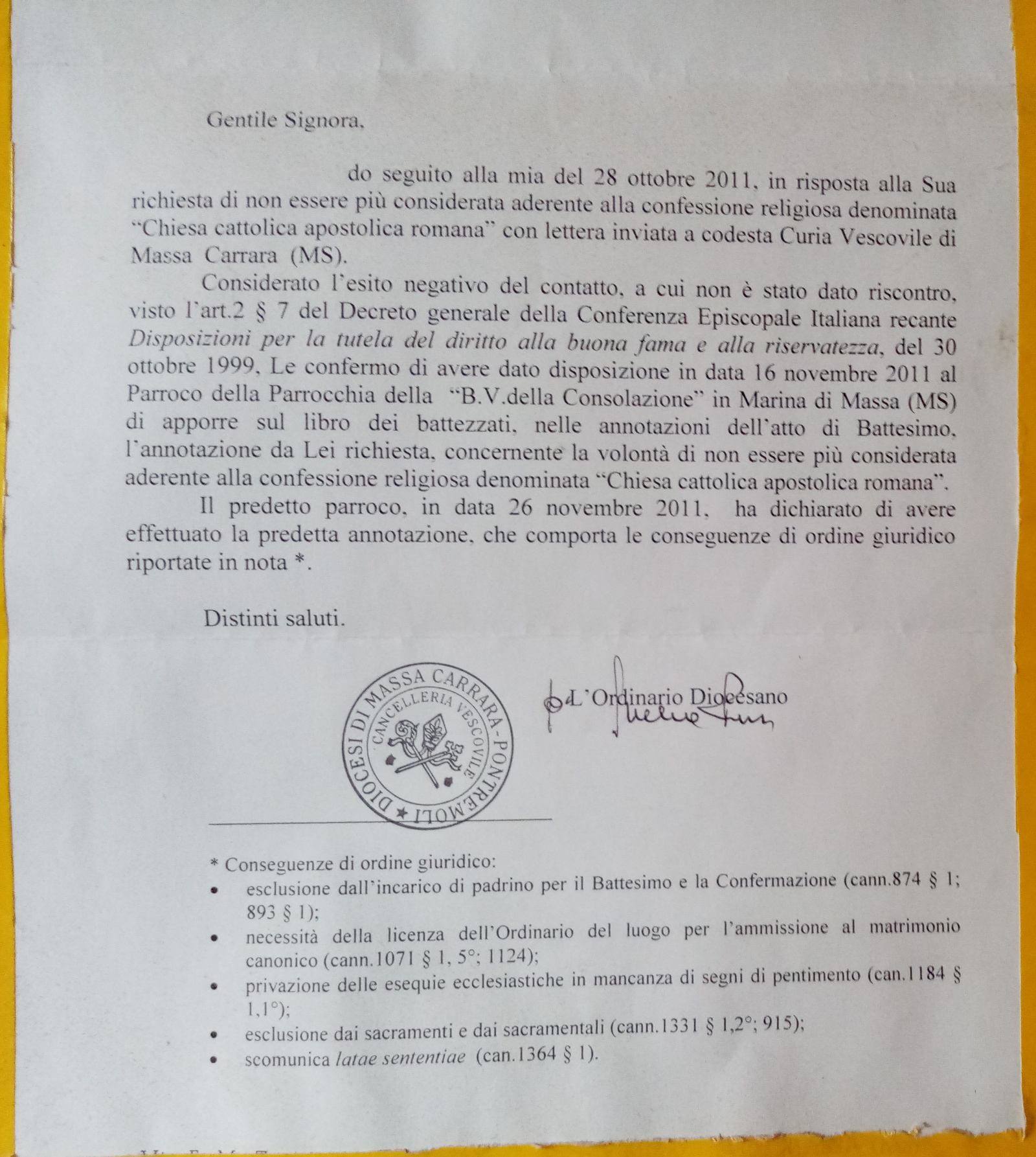 Una persona ha chiesto la rettifica dei dati relativi al proprio battesimo avvenuto a Beata Vergine della Consolazione - MASSA (MS) il 26/11/2011, dichiarando di non voler più far parte della Chiesa Cattolica.