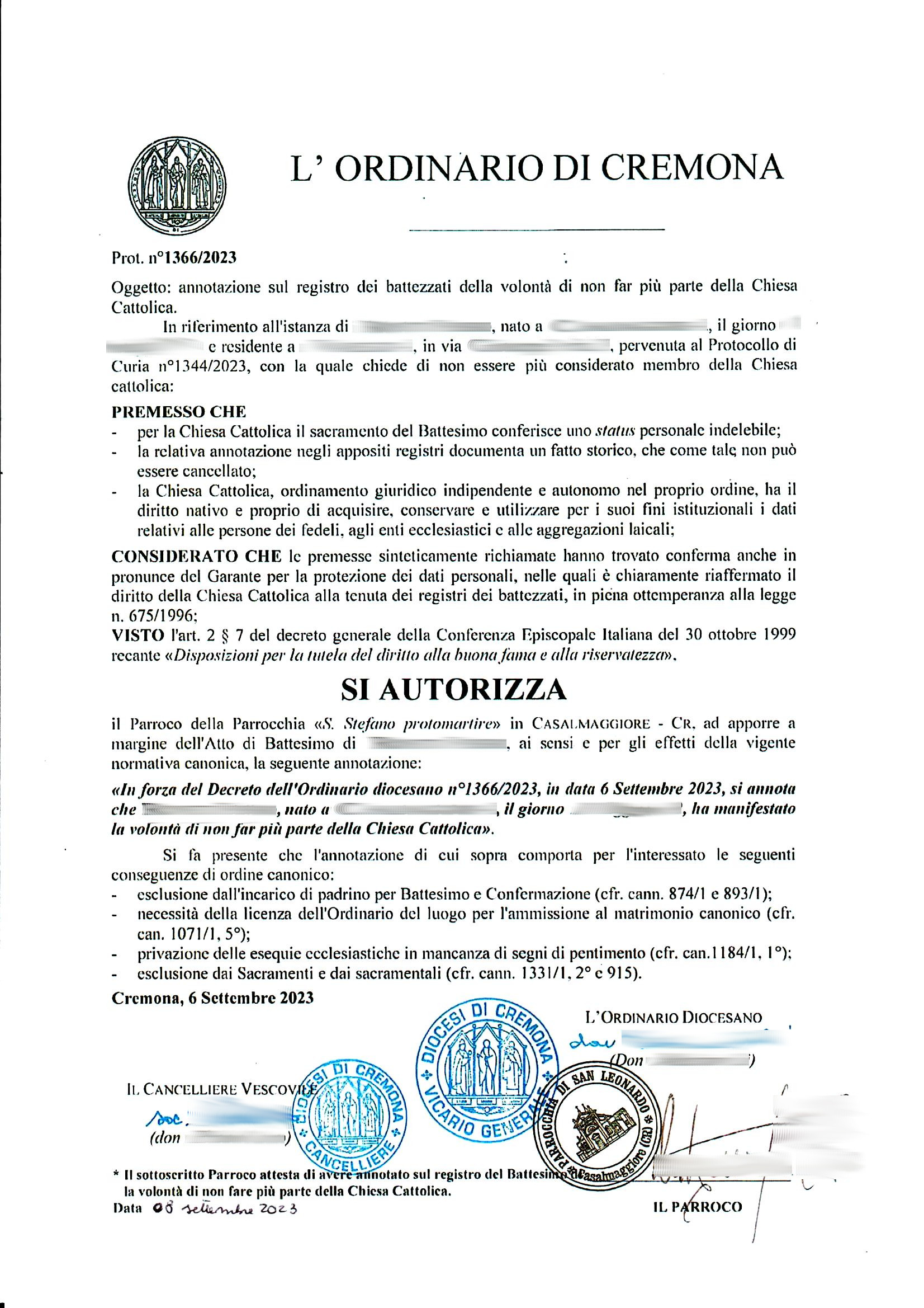 Una persona ha chiesto la rettifica dei dati relativi al proprio battesimo avvenuto a S. Stefano Protomartire - CASALMAGGIORE (CR) il 06/09/2023, dichiarando di non voler più far parte della Chiesa Cattolica.