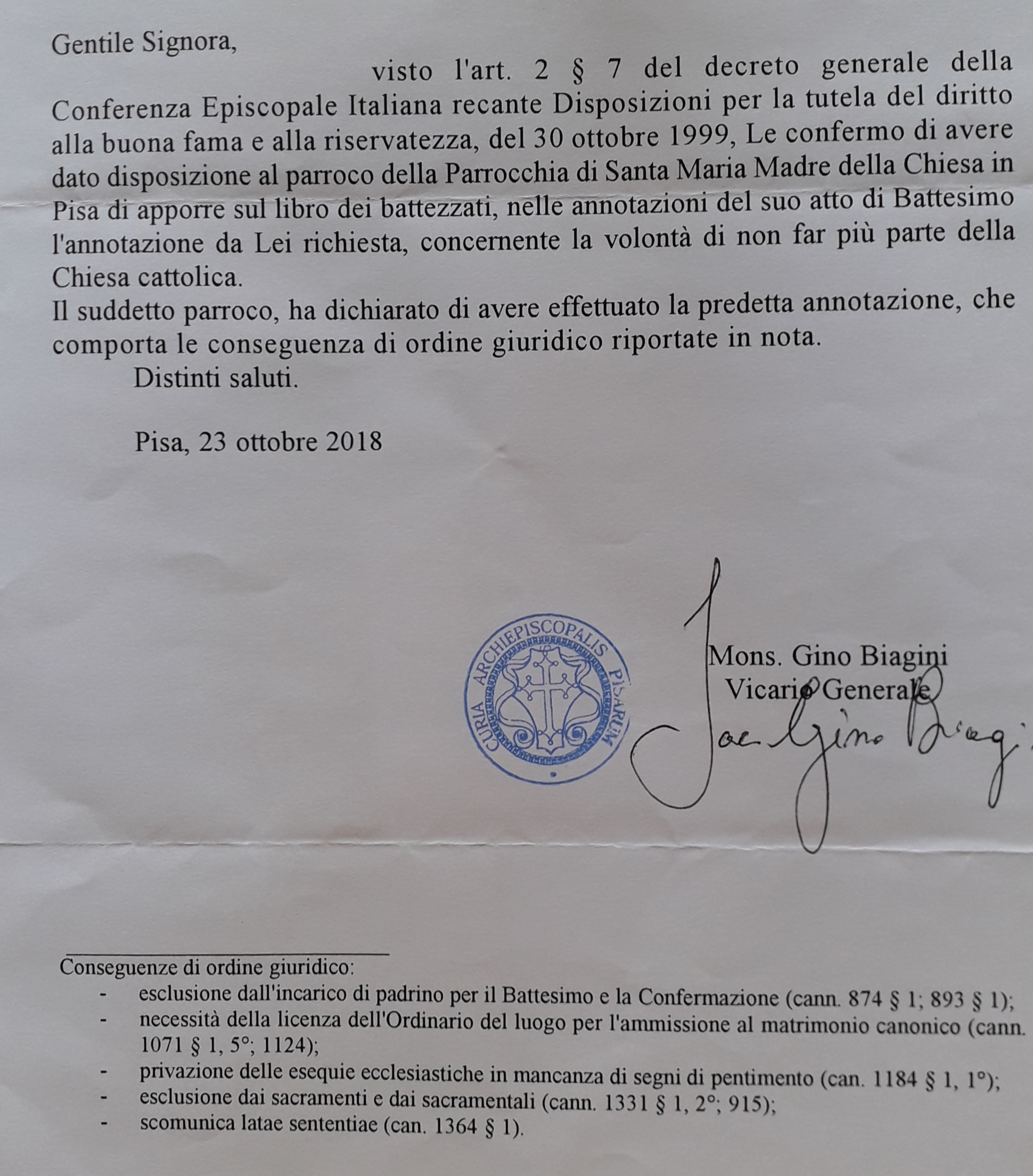 Una persona ha chiesto la rettifica dei dati relativi al proprio battesimo avvenuto a S. Maria Madre della Chiesa - PISA (PI) il 23/10/2018, dichiarando di non voler più far parte della Chiesa Cattolica.