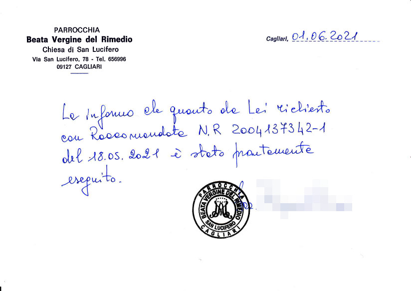 Una persona ha chiesto la rettifica dei dati relativi al proprio battesimo avvenuto a Beata Vergine del Rimedio - CAGLIARI (CA) il 01/06/2021, dichiarando di non voler più far parte della Chiesa Cattolica.
