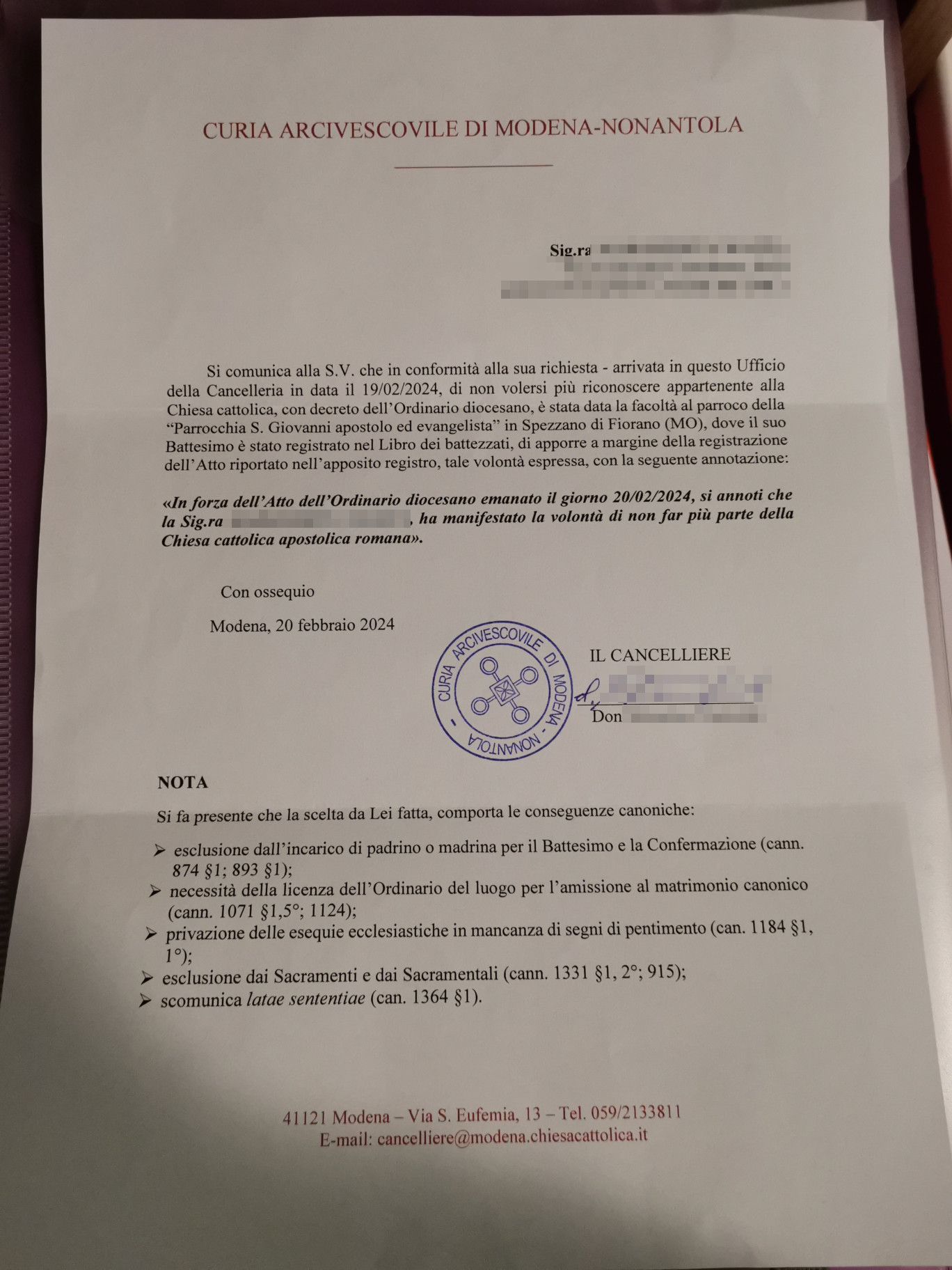 Una persona ha chiesto la rettifica dei dati relativi al proprio battesimo avvenuto a S. Giovanni Apostolo - FIORANO MODENESE (MO) il 20/02/2024, dichiarando di non voler più far parte della Chiesa Cattolica.