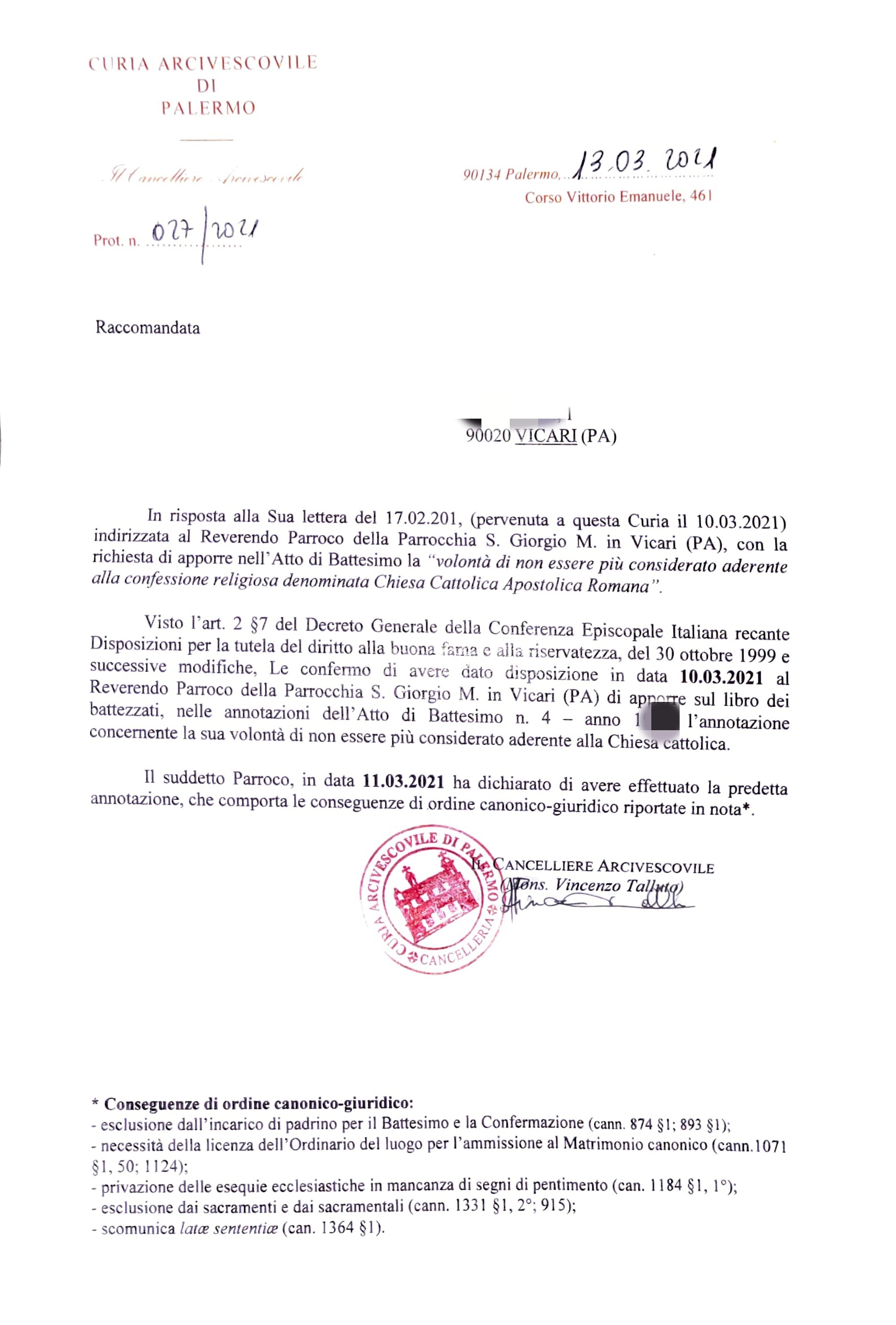 Una persona ha chiesto la rettifica dei dati relativi al proprio battesimo avvenuto a San Giorgio Martire - VICARI (PA) il 13/03/2021, dichiarando di non voler più far parte della Chiesa Cattolica.