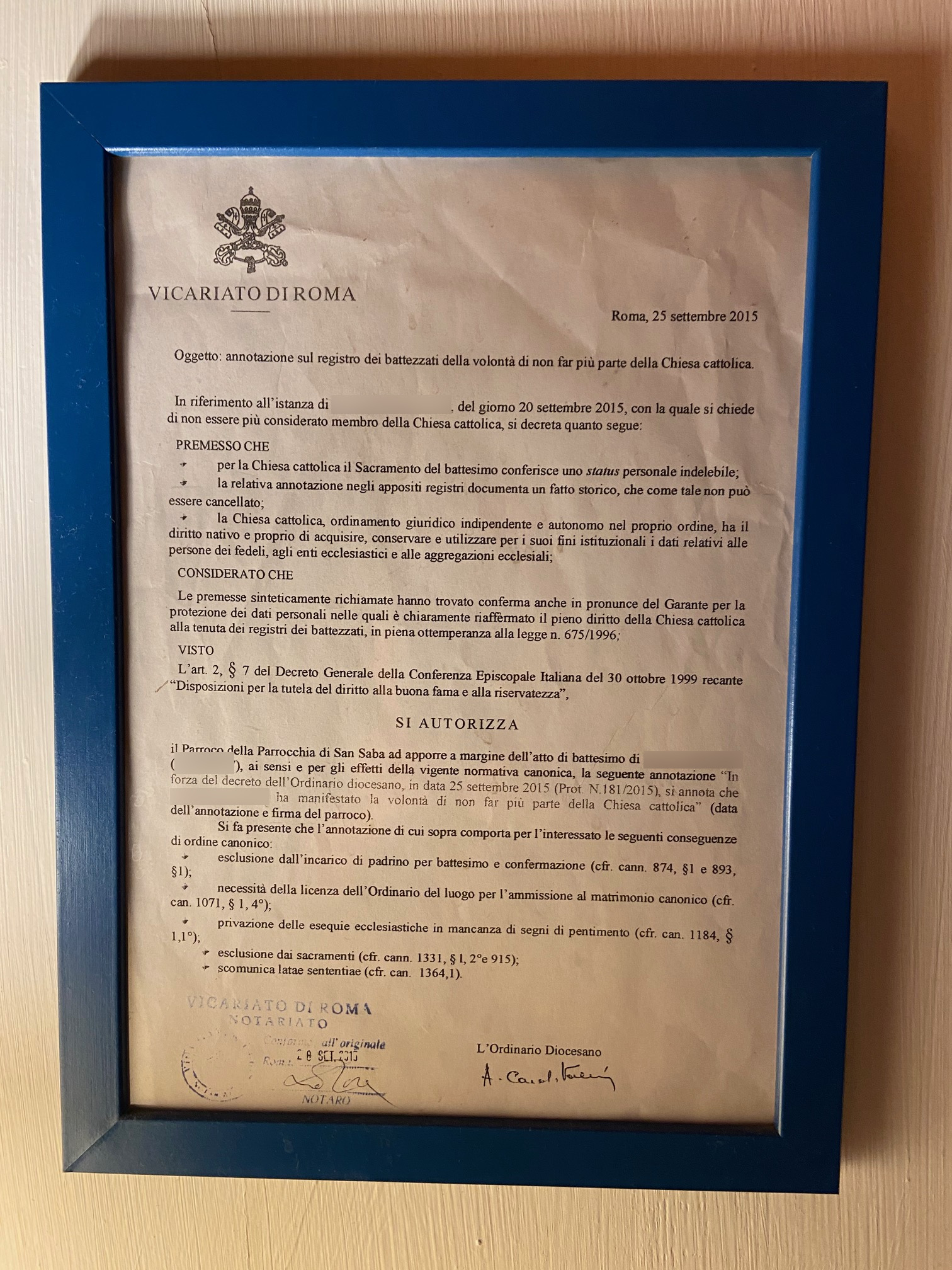"Certificato di sbattezzo" orgogliosamente messo in cornice e appeso al muro nel mio ingresso di casa.