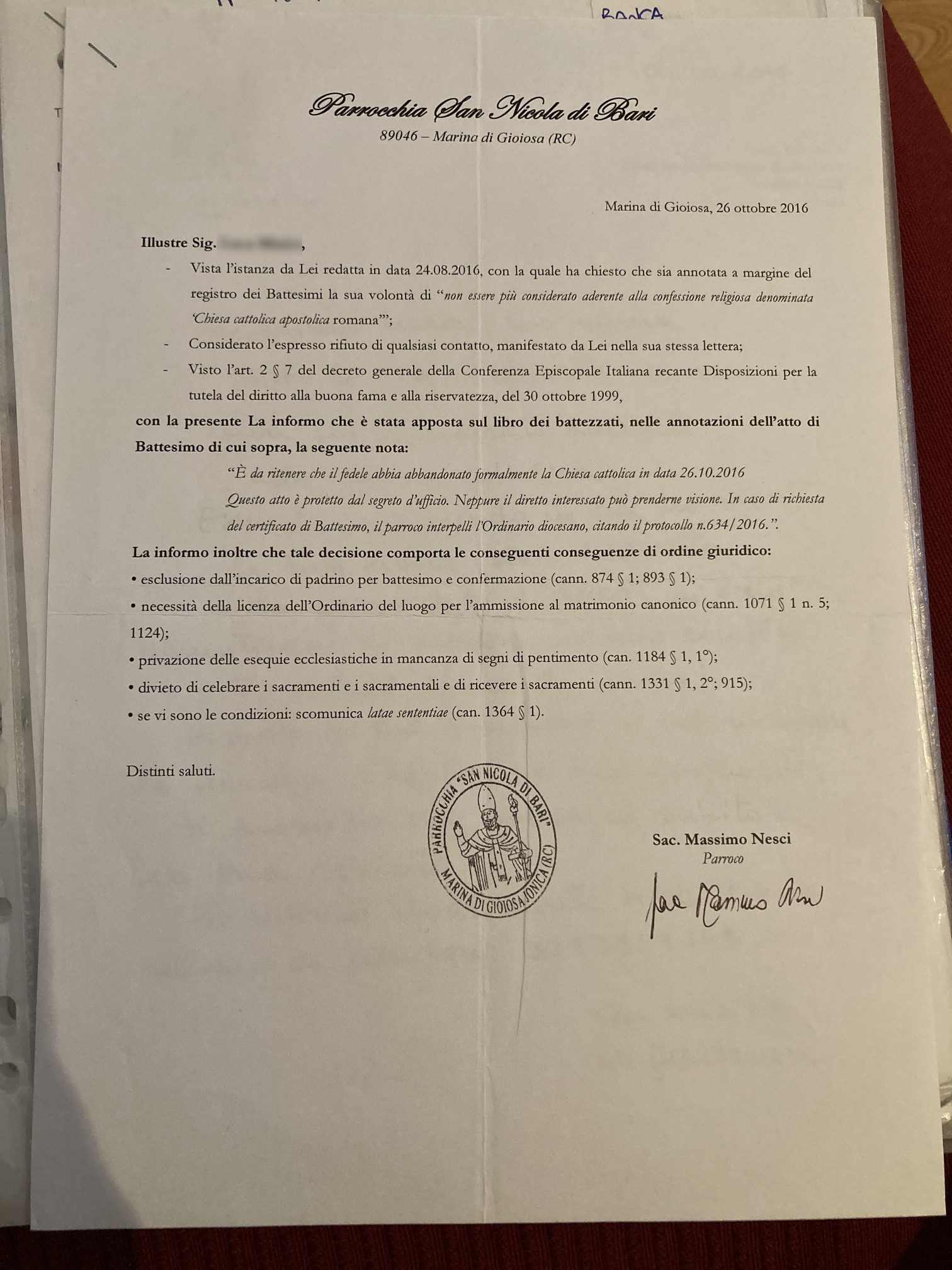 Una persona ha chiesto la rettifica dei dati relativi al proprio battesimo avvenuto a S. Nicola di Bari - MARINA DI GIOIOSA IONICA (RC) il 26/10/2016, dichiarando di non voler più far parte della Chiesa Cattolica.