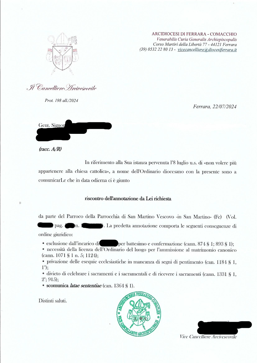 Una persona ha chiesto la rettifica dei dati relativi al proprio battesimo avvenuto a San Martino - FERRARA (FE) il 22/07/2024, dichiarando di non voler più far parte della Chiesa Cattolica.