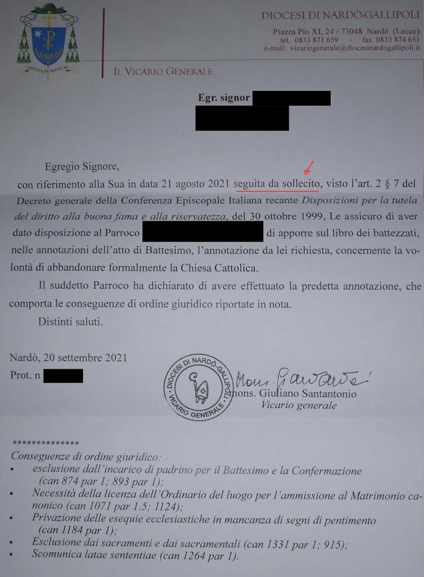 Una persona ha chiesto la rettifica dei dati relativi al proprio battesimo avvenuto a Trasfigurazione di Gesù Cristo - ALLISTE (LE) il 23/09/2021, dichiarando di non voler più far parte della Chiesa Cattolica.