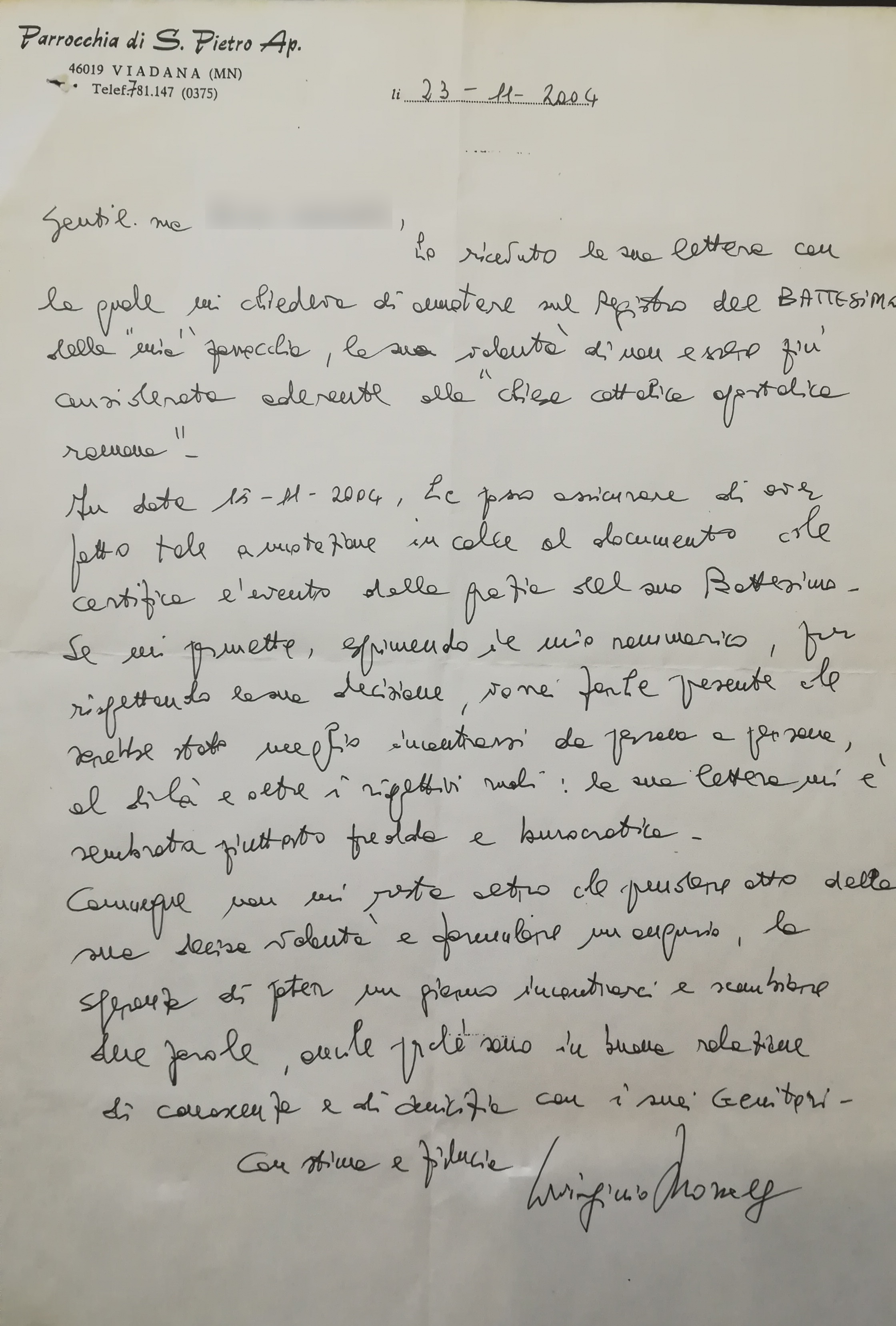 Una persona ha chiesto la rettifica dei dati relativi al proprio battesimo avvenuto a San Pietro Apostolo - VIADANA (MN) il 15/11/2004, dichiarando di non voler più far parte della Chiesa Cattolica.