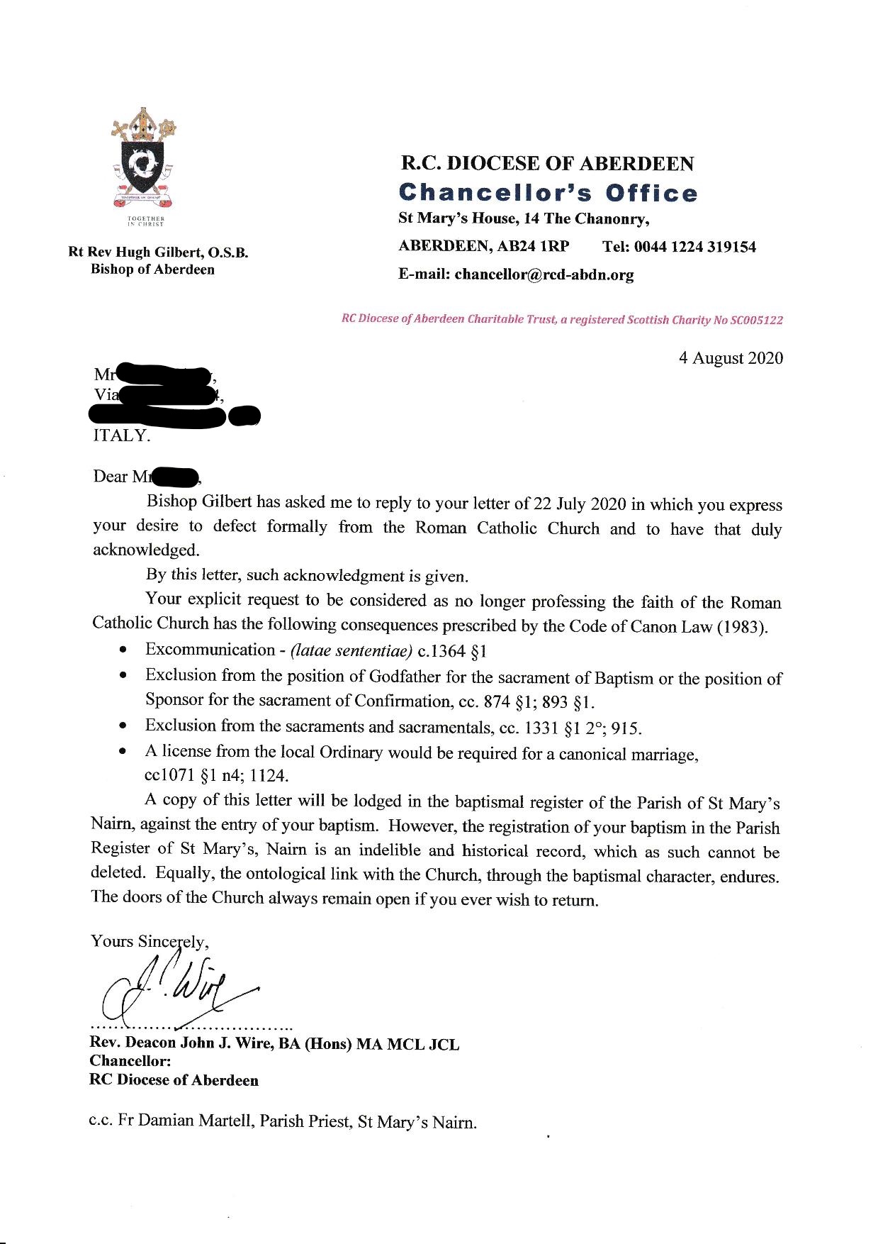 Una persona ha chiesto la rettifica dei dati relativi al proprio battesimo avvenuto a St Mary’s - NAIRN, UK il 04/08/2020, dichiarando di non voler più far parte della Chiesa Cattolica.