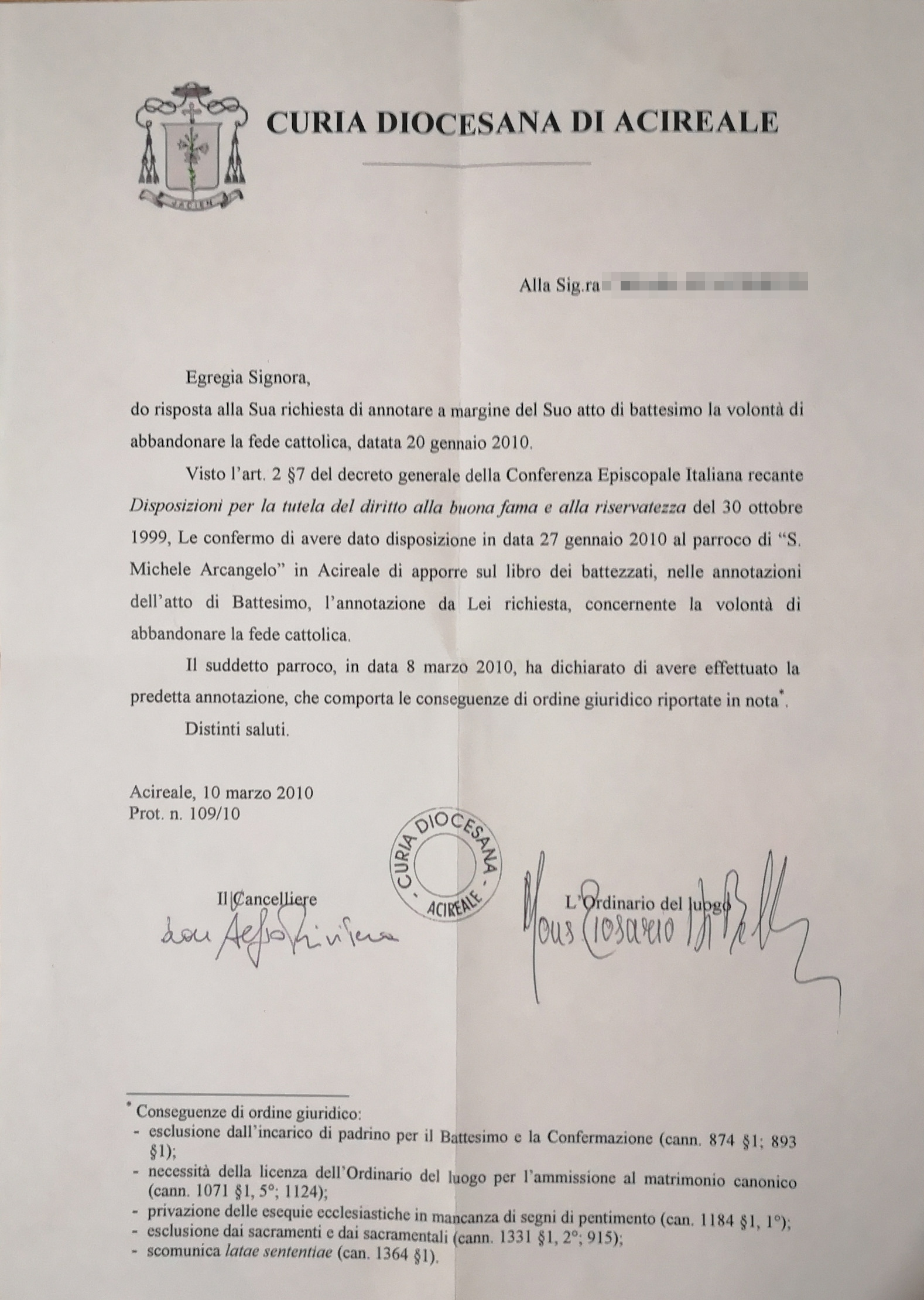 Una persona ha chiesto la rettifica dei dati relativi al proprio battesimo avvenuto a S. Michele Arcangelo - ACIREALE (CT) il 10/03/2010, dichiarando di non voler più far parte della Chiesa Cattolica.