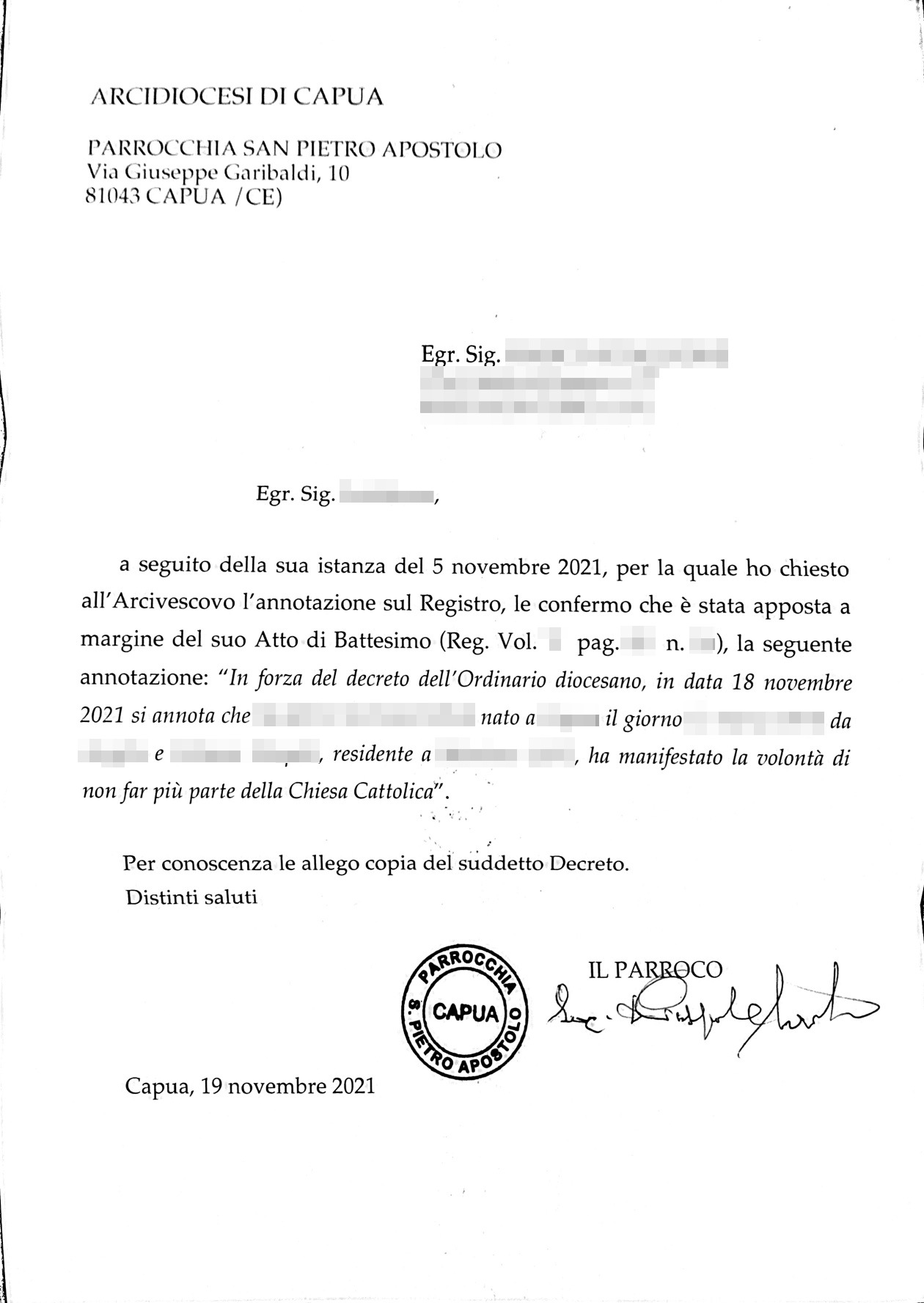 Una persona ha chiesto la rettifica dei dati relativi al proprio battesimo avvenuto a S. Pietro Apostolo - CAPUA (CE) il 29/11/2021, dichiarando di non voler più far parte della Chiesa Cattolica.