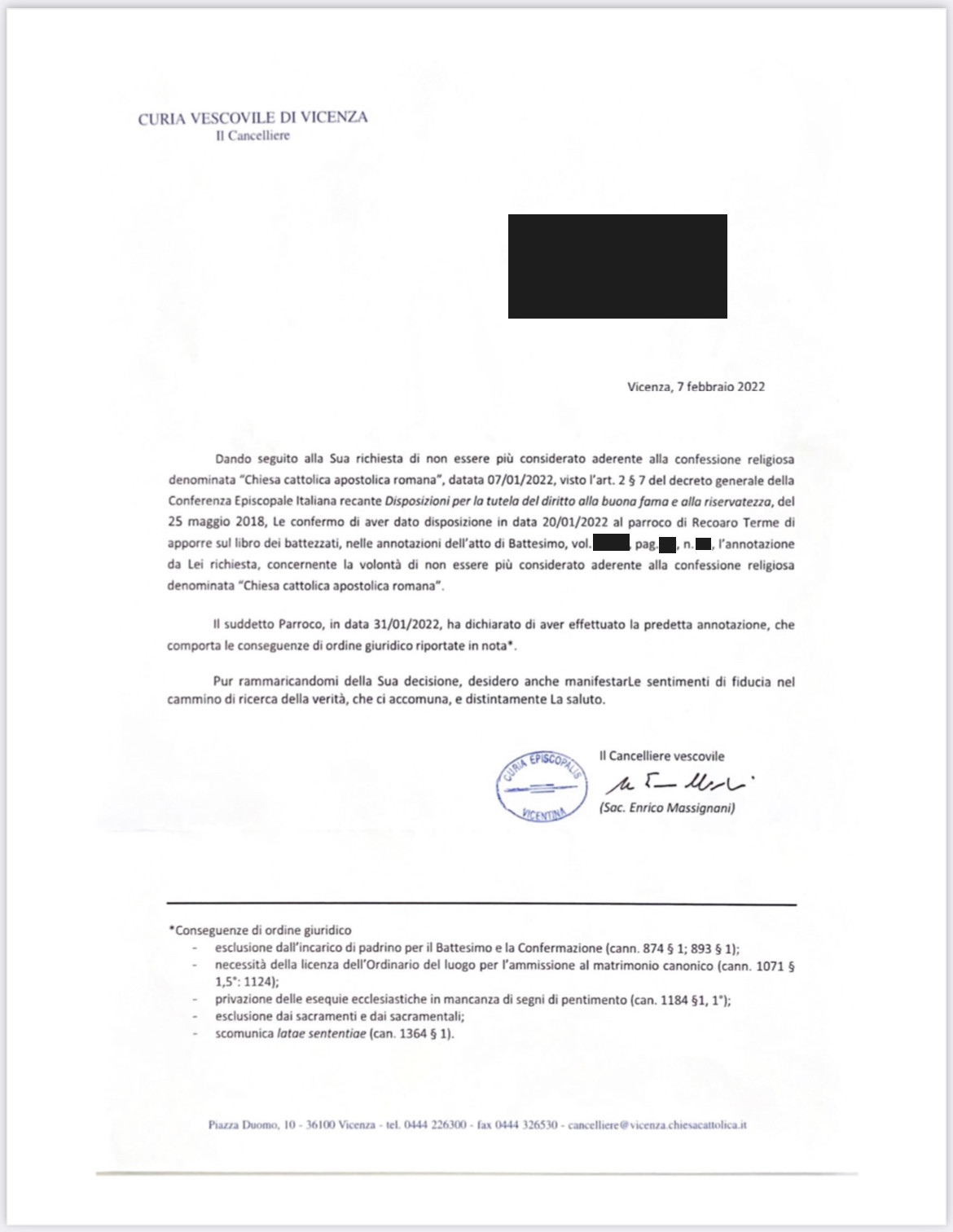 Una persona ha chiesto la rettifica dei dati relativi al proprio battesimo avvenuto a S. Antonio Abate - RECOARO TERME (VI) il 07/02/2022, dichiarando di non voler più far parte della Chiesa Cattolica.