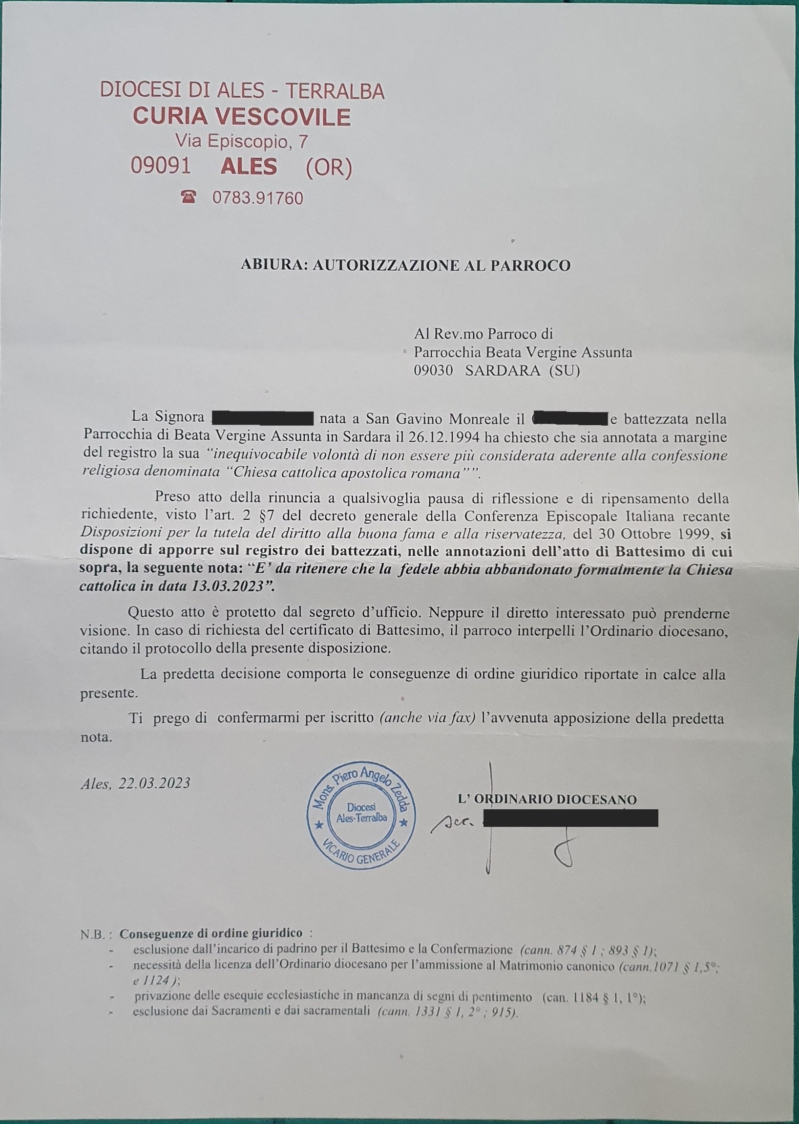 Una persona ha chiesto la rettifica dei dati relativi al proprio battesimo avvenuto a Beata Vergine Assunta - SARDARA (SU) il 22/03/2023, dichiarando di non voler più far parte della Chiesa Cattolica.