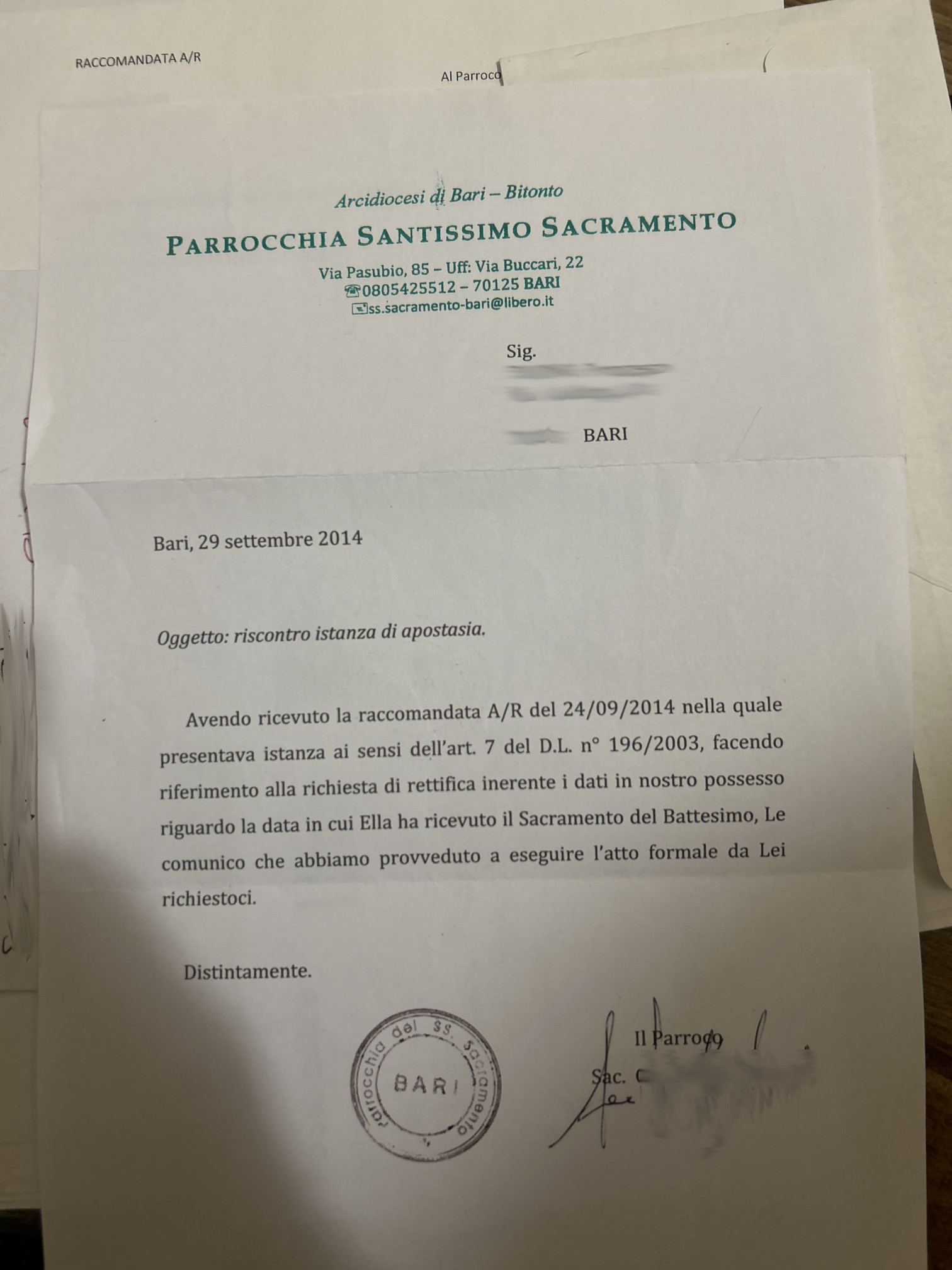 Una persona ha chiesto la rettifica dei dati relativi al proprio battesimo avvenuto a Ss. Sacramento - BARI (BA) il 29/09/2014, dichiarando di non voler più far parte della Chiesa Cattolica.