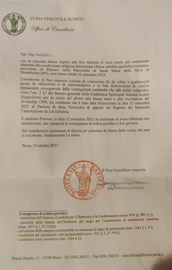 Una persona ha chiesto la rettifica dei dati relativi al proprio battesimo avvenuto a S. Maria della Neve - INVERNO E MONTELEONE (PV) il 12/10/2023, dichiarando di non voler più far parte della Chiesa Cattolica.