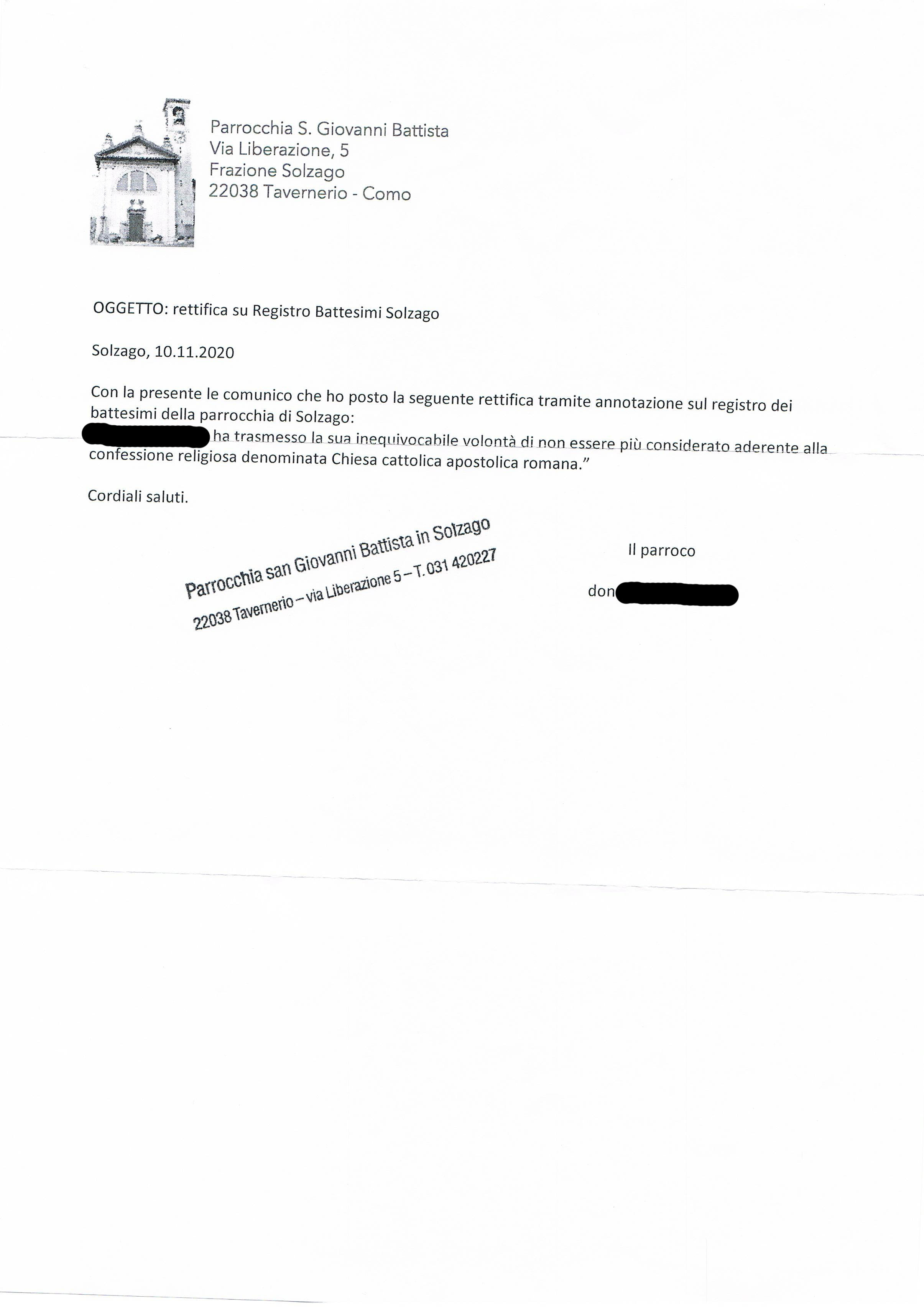 Una persona ha chiesto la rettifica dei dati relativi al proprio battesimo avvenuto a S. Giovanni Battista - TAVERNERIO (CO) il 10/11/2020, dichiarando di non voler più far parte della Chiesa Cattolica.