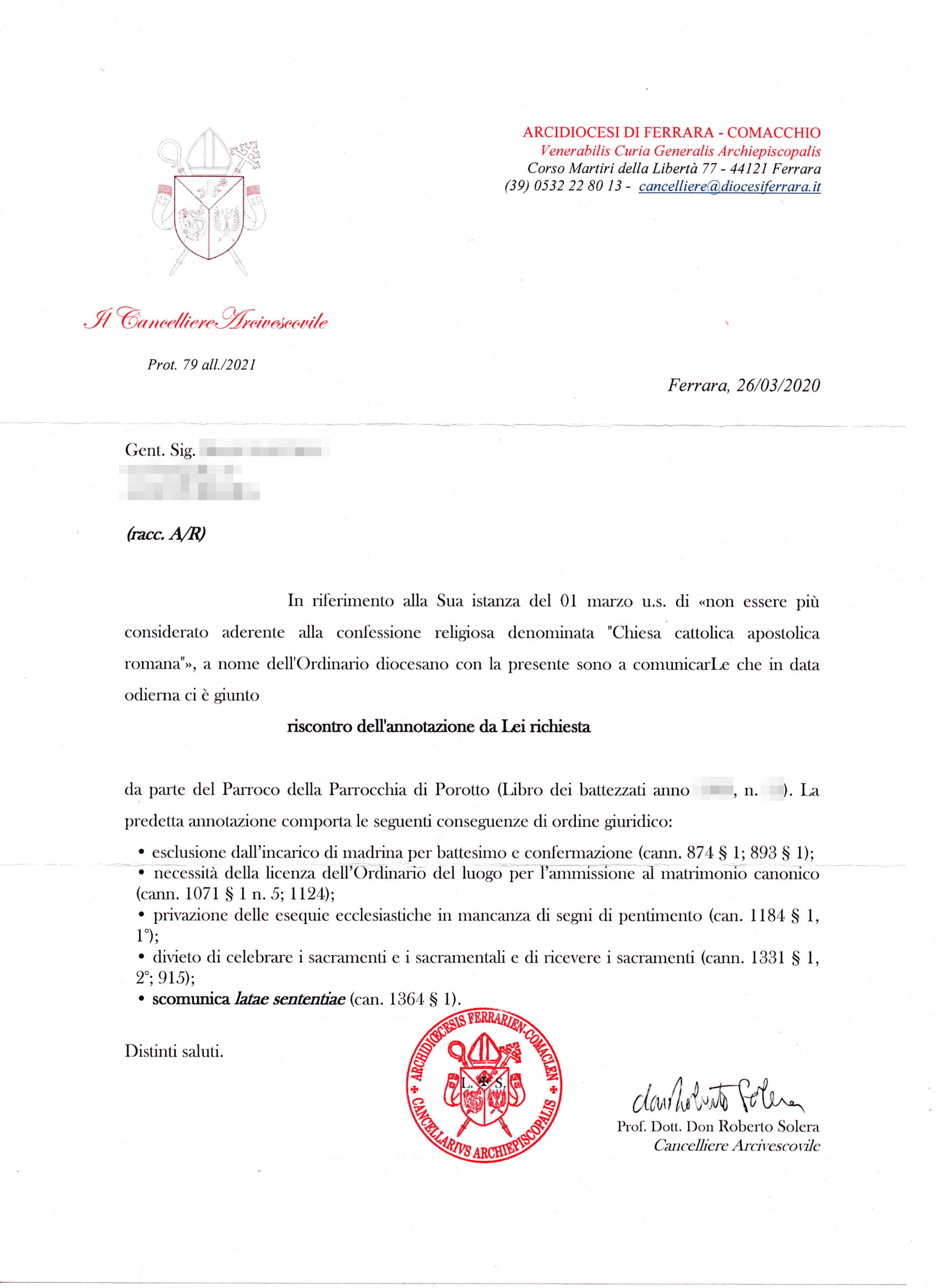 Una persona ha chiesto la rettifica dei dati relativi al proprio battesimo avvenuto a Santi Filippo e Giacomo - FERRARA (FE) il 26/03/2021, dichiarando di non voler più far parte della Chiesa Cattolica.