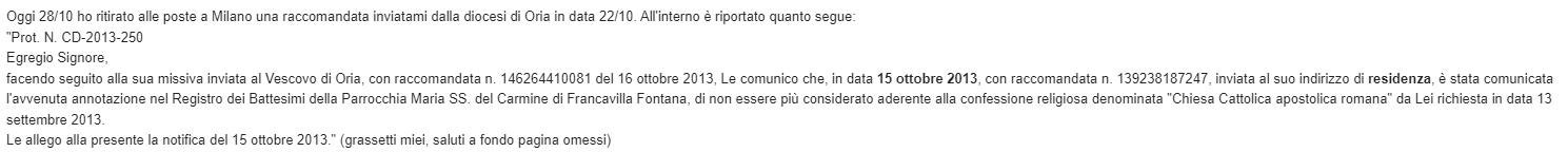 Una persona ha chiesto la rettifica dei dati relativi al proprio battesimo avvenuto a Chiesa del Carmine - FRANCAVILLA FONTANA (BR) il 15/10/2013, dichiarando di non voler più far parte della Chiesa Cattolica.