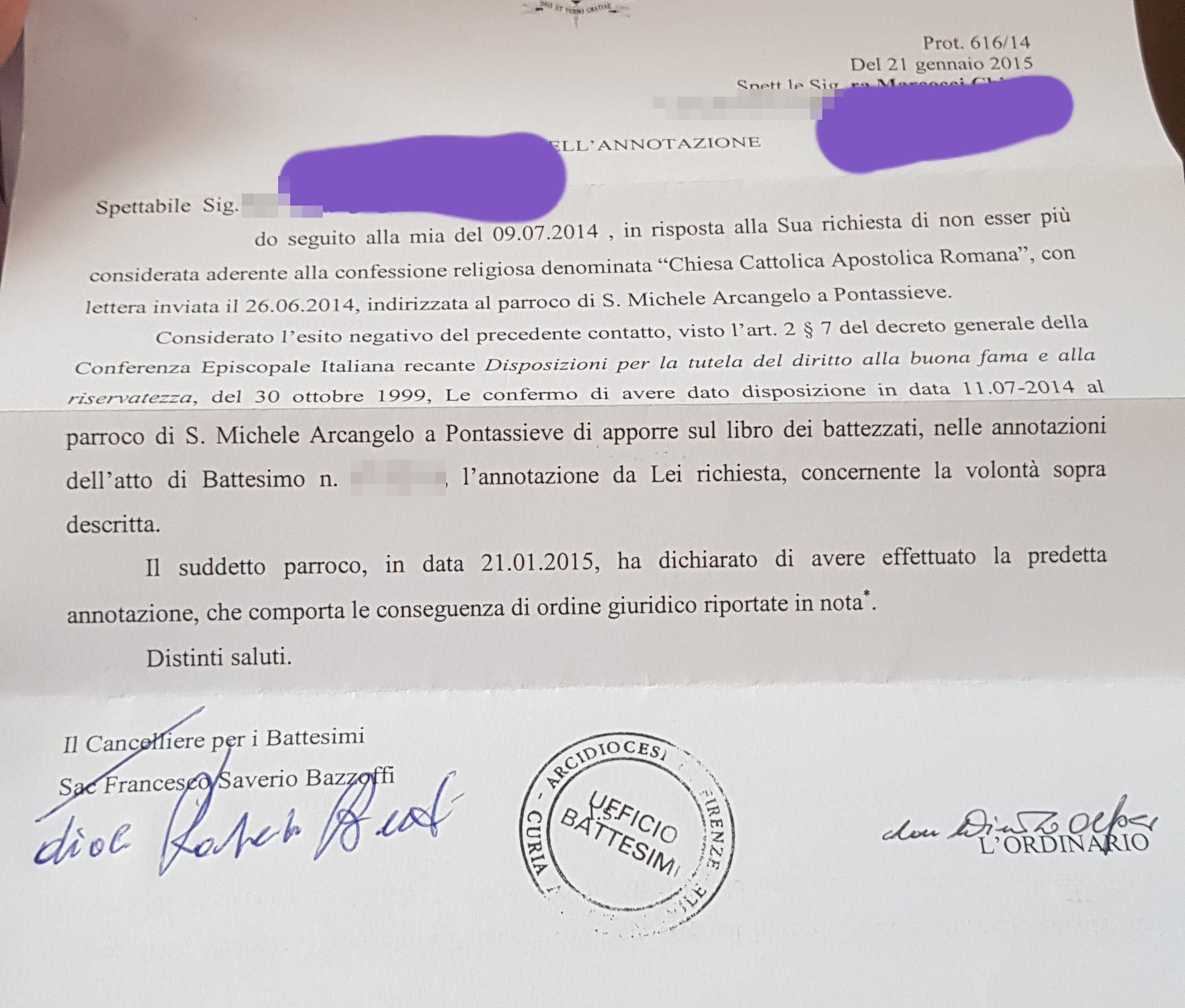 Una persona ha chiesto la rettifica dei dati relativi al proprio battesimo avvenuto a S. Michele Arcangelo a Pontassieve - PONTASSIEVE (FI) il 21/01/2015, dichiarando di non voler più far parte della Chiesa Cattolica.