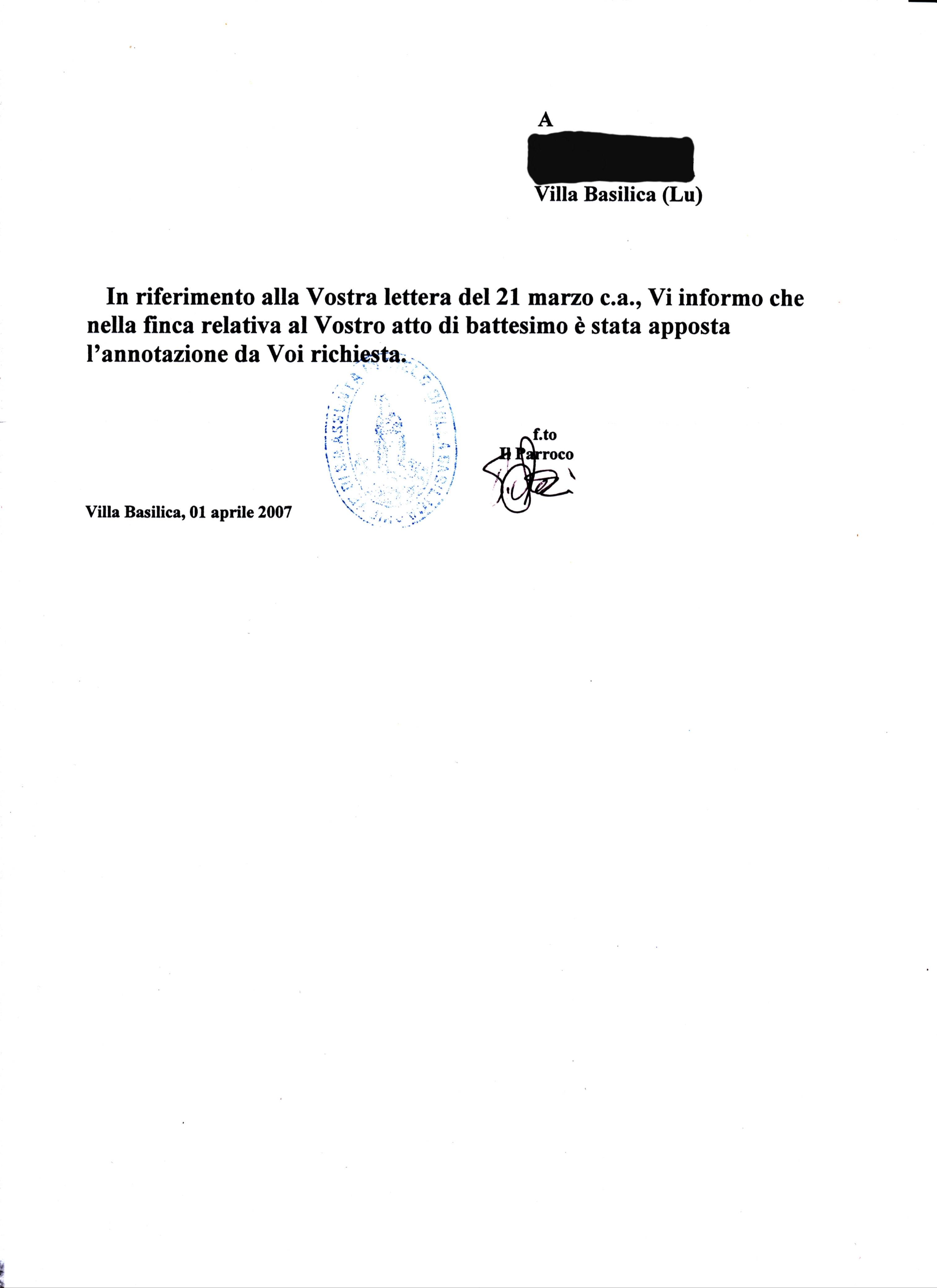 Una persona ha chiesto la rettifica dei dati relativi al proprio battesimo avvenuto a S. Maria Assunta - VILLA BASILICA (LU) il 01/04/2007, dichiarando di non voler più far parte della Chiesa Cattolica.