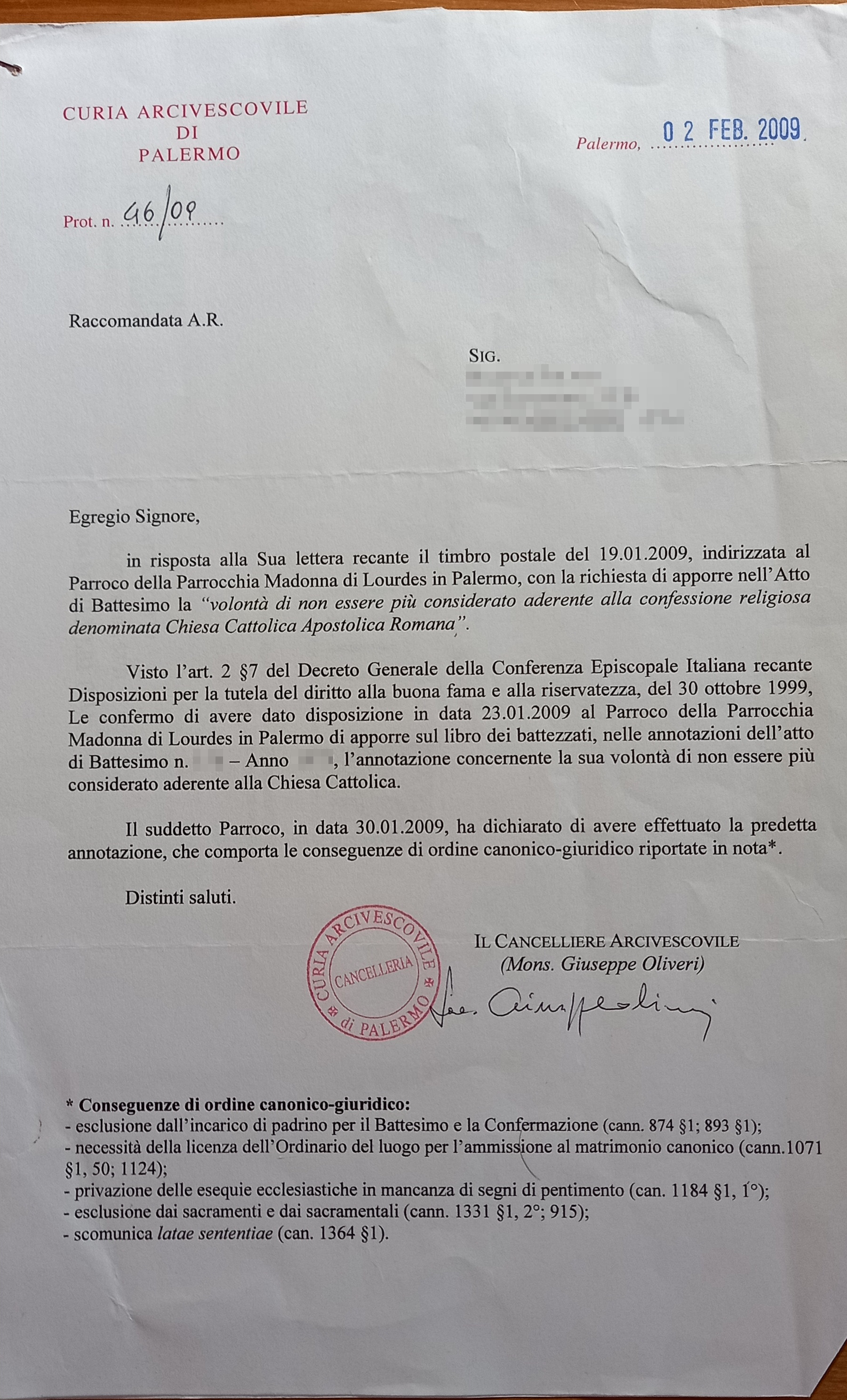 Una persona ha chiesto la rettifica dei dati relativi al proprio battesimo avvenuto a Madonna di Lourdes - PALERMO (PA) il 02/02/2009, dichiarando di non voler più far parte della Chiesa Cattolica.