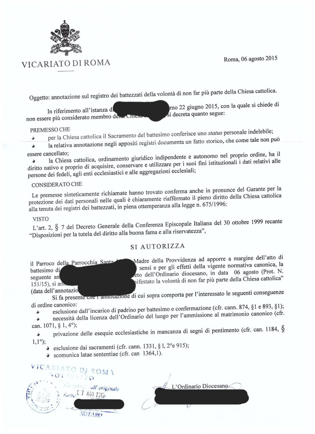 Una persona ha chiesto la rettifica dei dati relativi al proprio battesimo avvenuto a S. Maria Madre della Provvidenza - ROMA (RM) il 06/08/2015, dichiarando di non voler più far parte della Chiesa Cattolica.