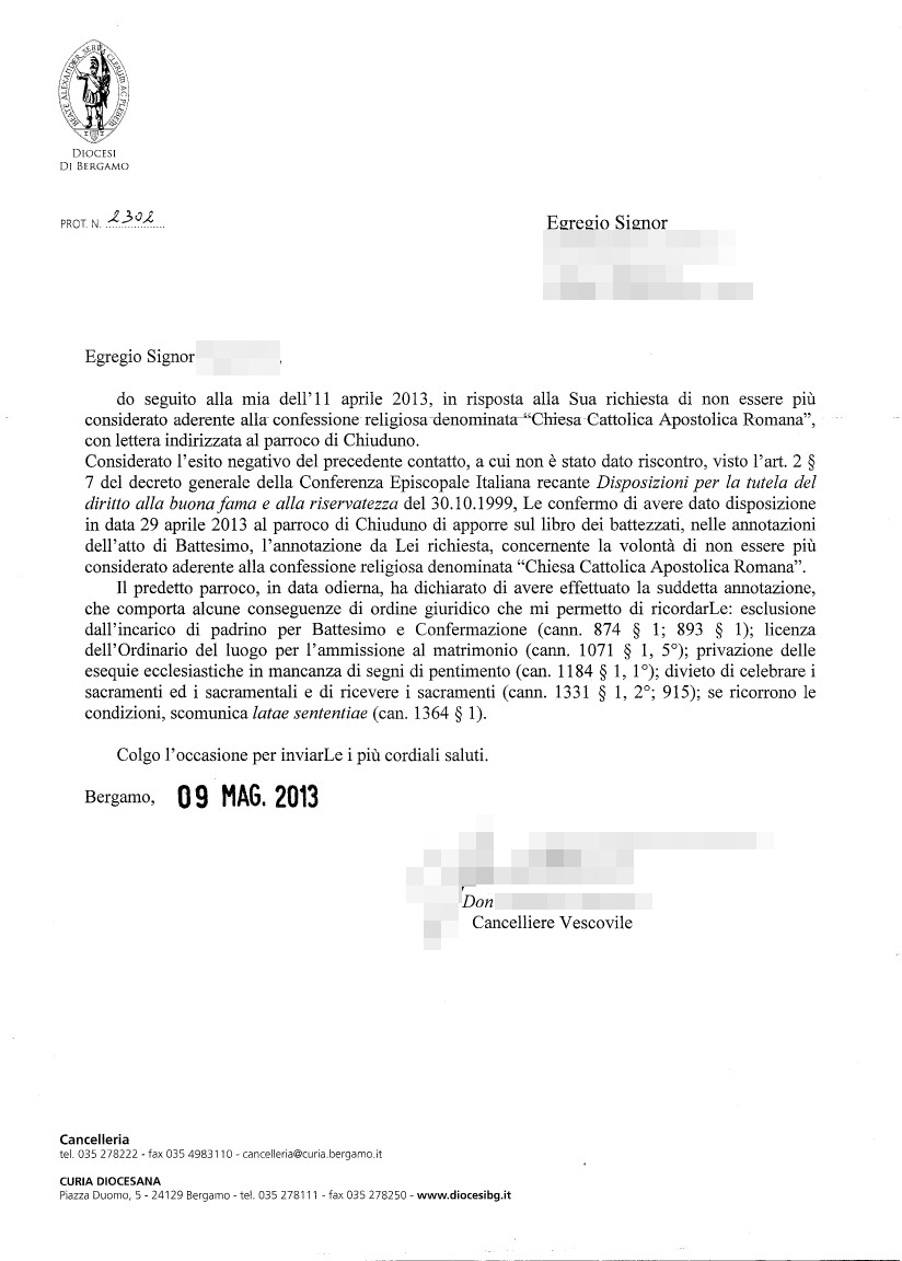Una persona ha chiesto la rettifica dei dati relativi al proprio battesimo avvenuto a S. Maria Assunta - CHIUDUNO (BG) il 09/05/2013, dichiarando di non voler più far parte della Chiesa Cattolica.