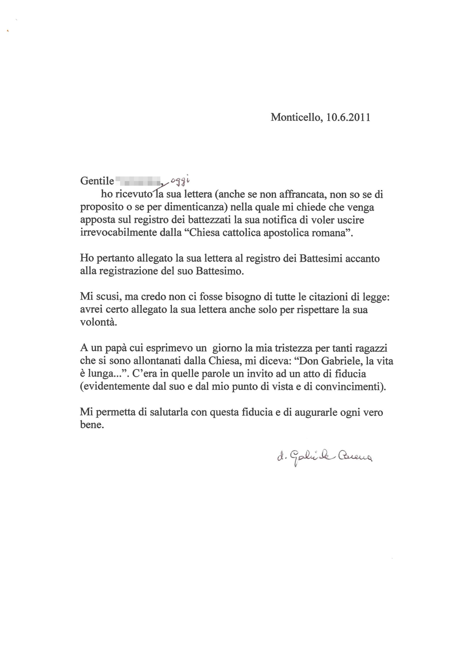 Una persona ha chiesto la rettifica dei dati relativi al proprio battesimo avvenuto a S. Maria della Purificazione - MONTICELLO BRIANZA (LC) il 10/06/2011, dichiarando di non voler più far parte della Chiesa Cattolica.