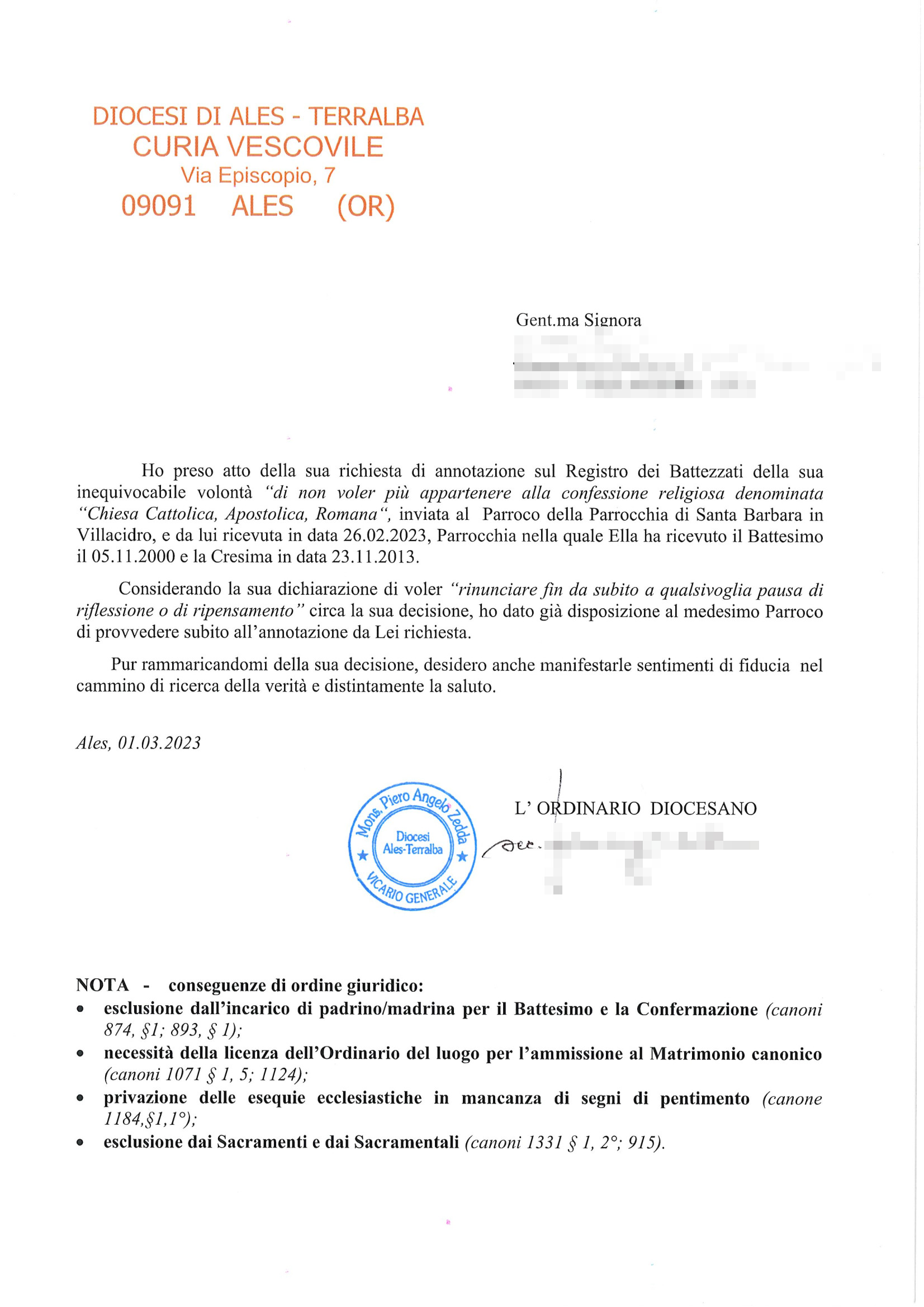 Una persona ha chiesto la rettifica dei dati relativi al proprio battesimo avvenuto a S. Barbara - VILLACIDRO (SU) il 07/03/2023, dichiarando di non voler più far parte della Chiesa Cattolica.