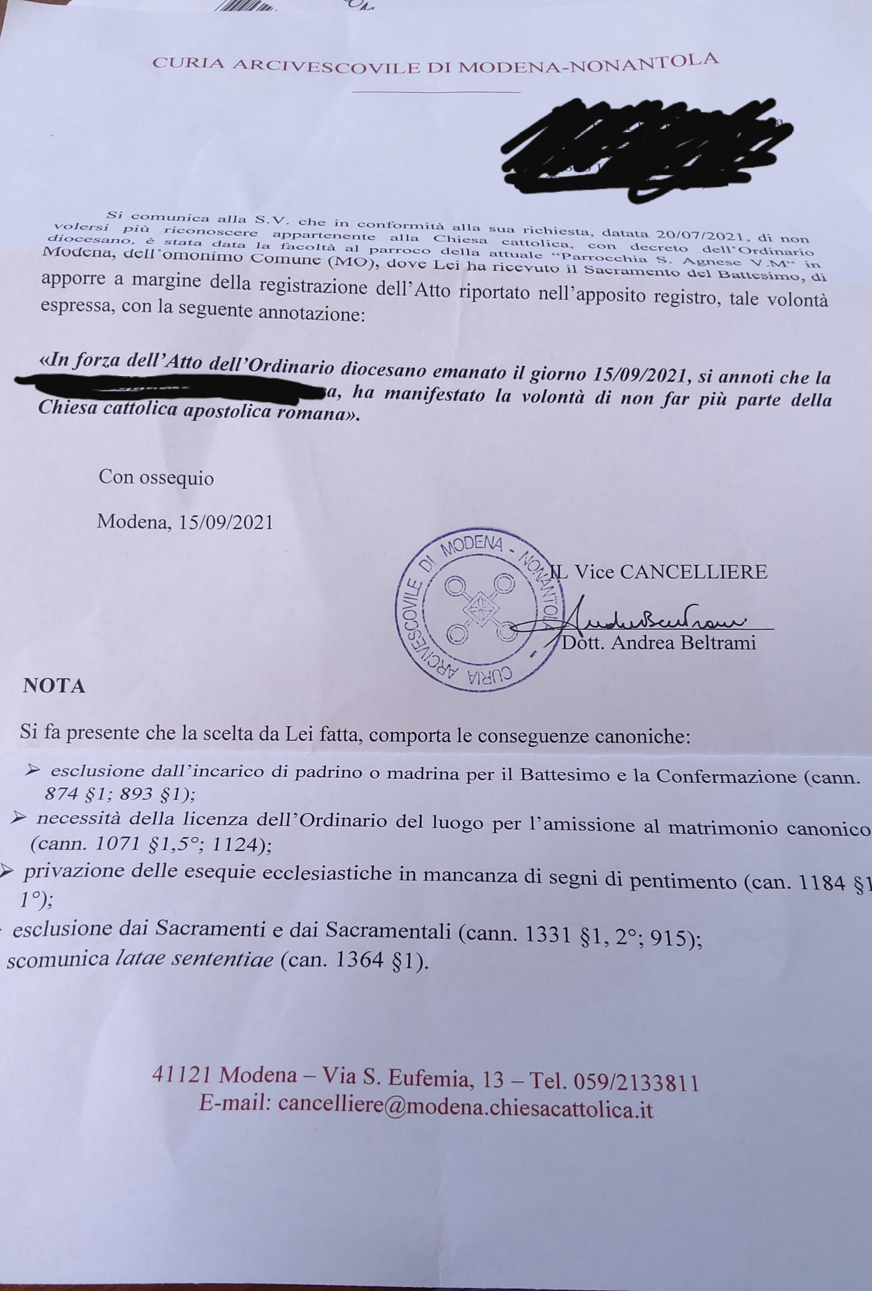 Una persona ha chiesto la rettifica dei dati relativi al proprio battesimo avvenuto a S. Agnese Vergine e Martire - MODENA (MO) il 15/09/2021, dichiarando di non voler più far parte della Chiesa Cattolica.
