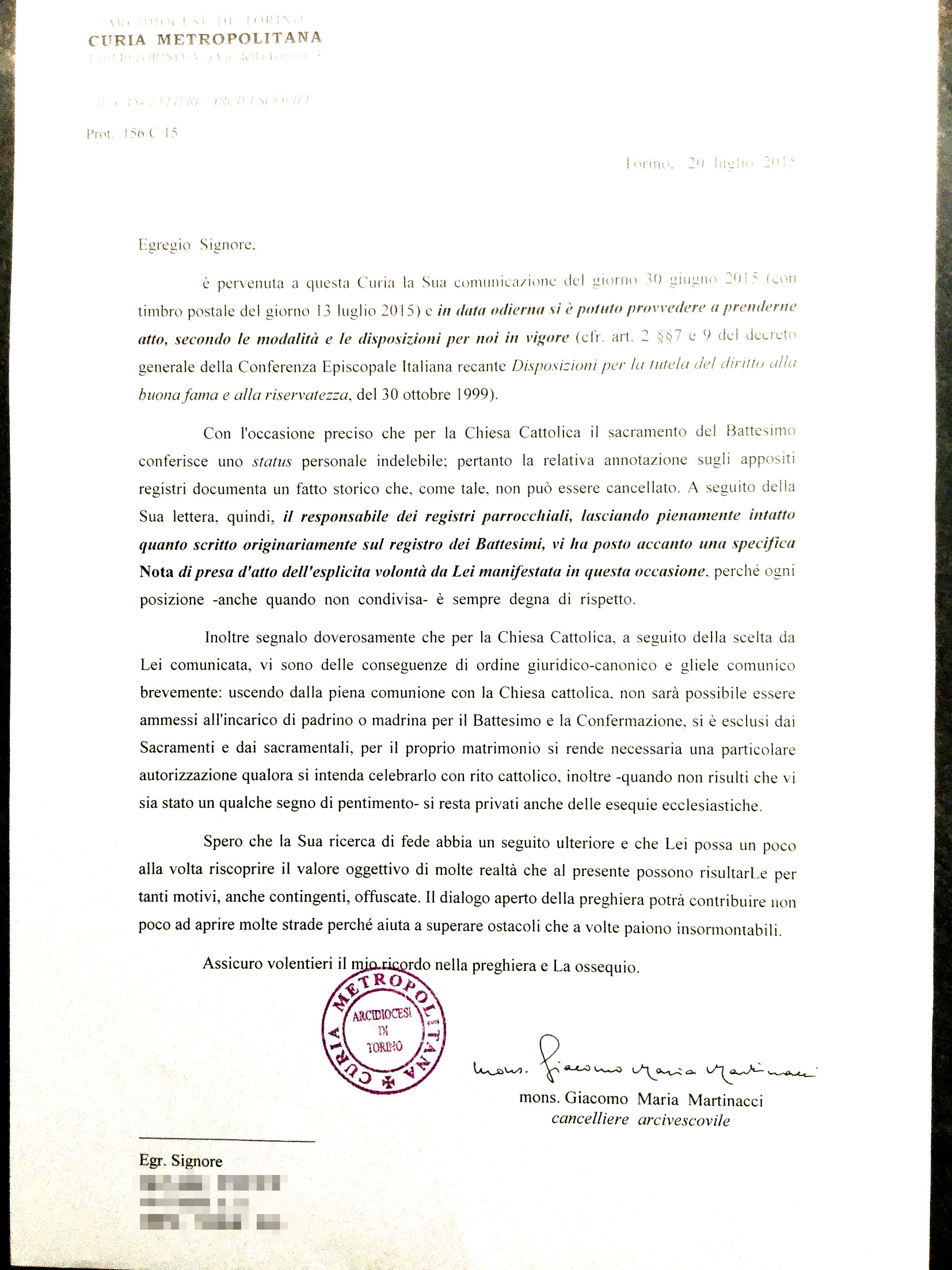 Una persona ha chiesto la rettifica dei dati relativi al proprio battesimo avvenuto a S. Vincenzo Martire - NOLE (TO) il 13/07/2015, dichiarando di non voler più far parte della Chiesa Cattolica.