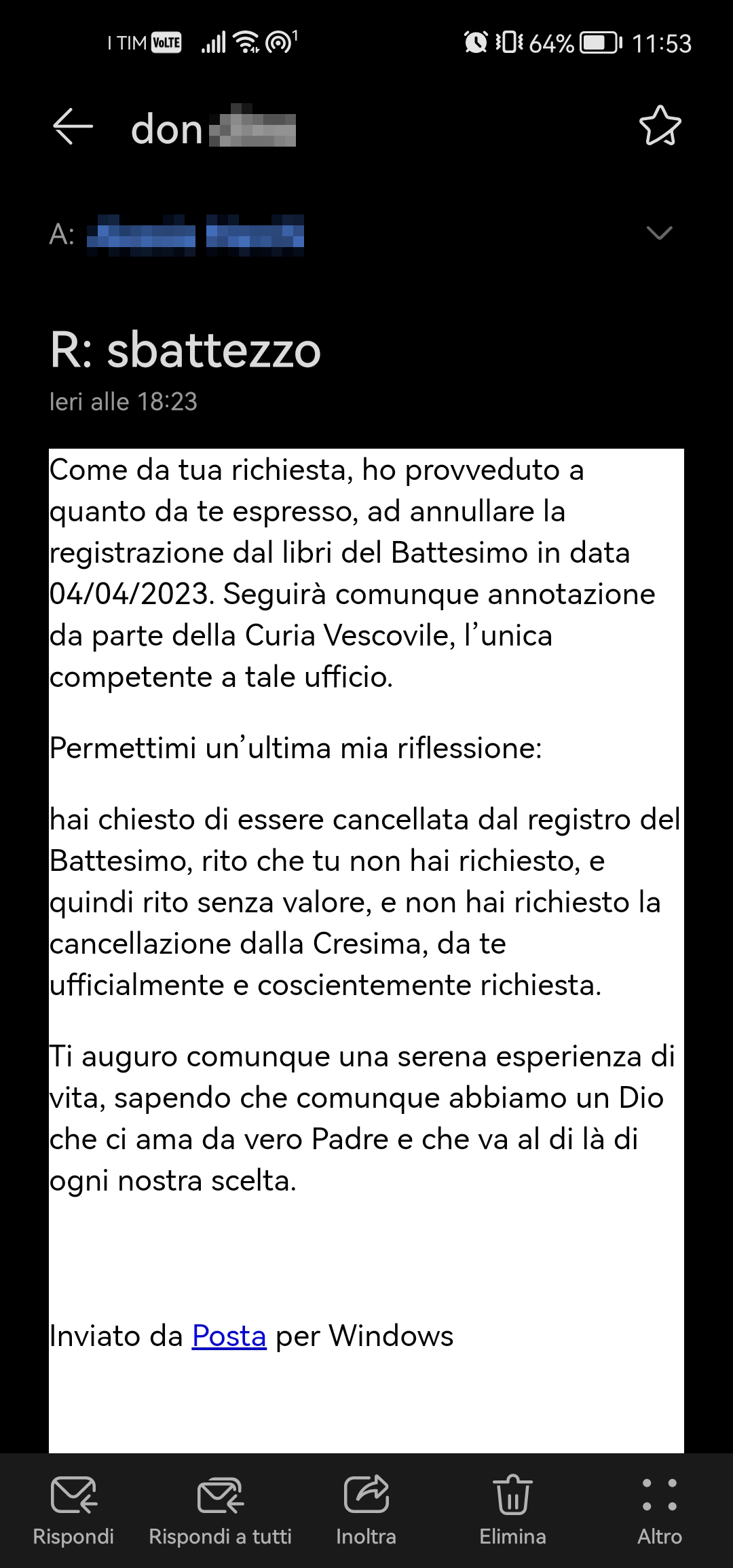 Una persona ha chiesto la rettifica dei dati relativi al proprio battesimo avvenuto a San Michele Arcangelo - SAN MICHELE ALL'ADIGE (TN) il 04/04/2023, dichiarando di non voler più far parte della Chiesa Cattolica.