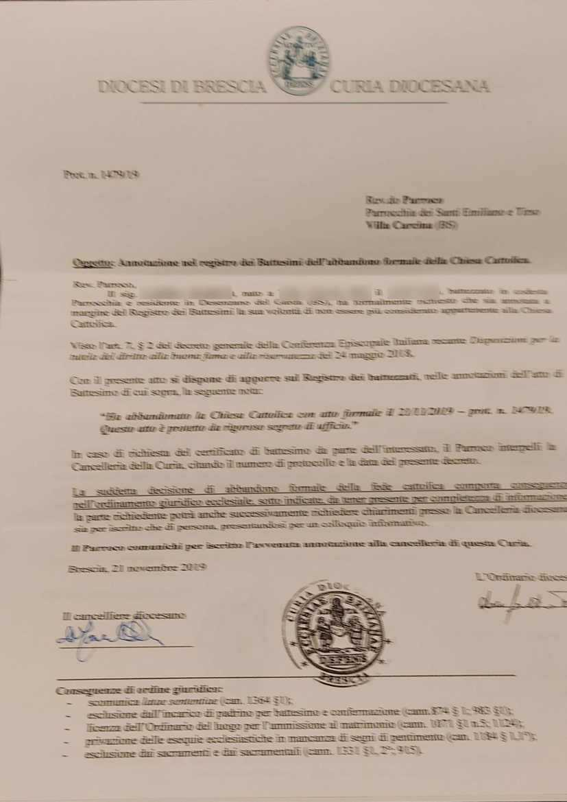 Una persona ha chiesto la rettifica dei dati relativi al proprio battesimo avvenuto a Santi Emiliano e Tirso - VILLA CARCINA (BS) il 21/11/2019, dichiarando di non voler più far parte della Chiesa Cattolica.