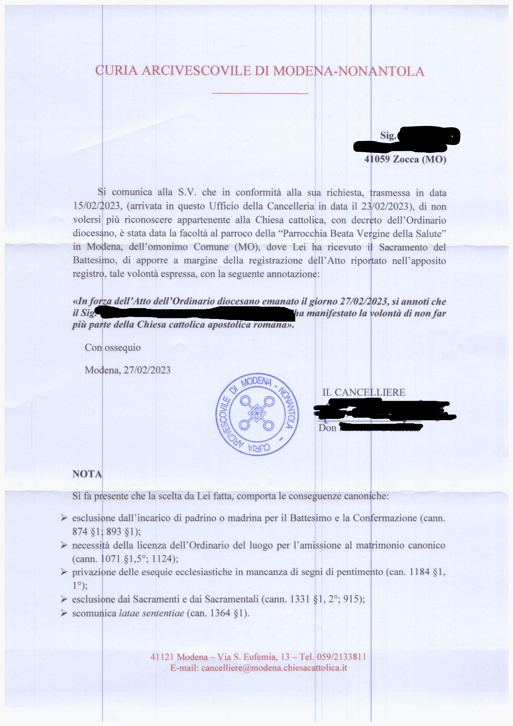 Una persona ha chiesto la rettifica dei dati relativi al proprio battesimo avvenuto a Beata Vergine della Salute - MODENA (MO) il 27/02/2023, dichiarando di non voler più far parte della Chiesa Cattolica.