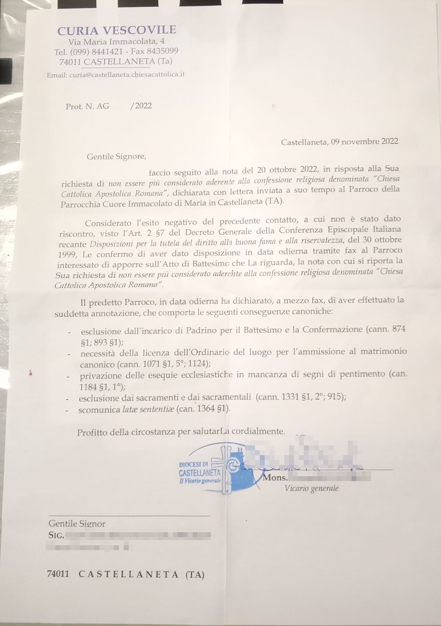 Una persona ha chiesto la rettifica dei dati relativi al proprio battesimo avvenuto a Cuore Immacolato di Maria - CASTELLANETA (TA) il 09/11/2022, dichiarando di non voler più far parte della Chiesa Cattolica.