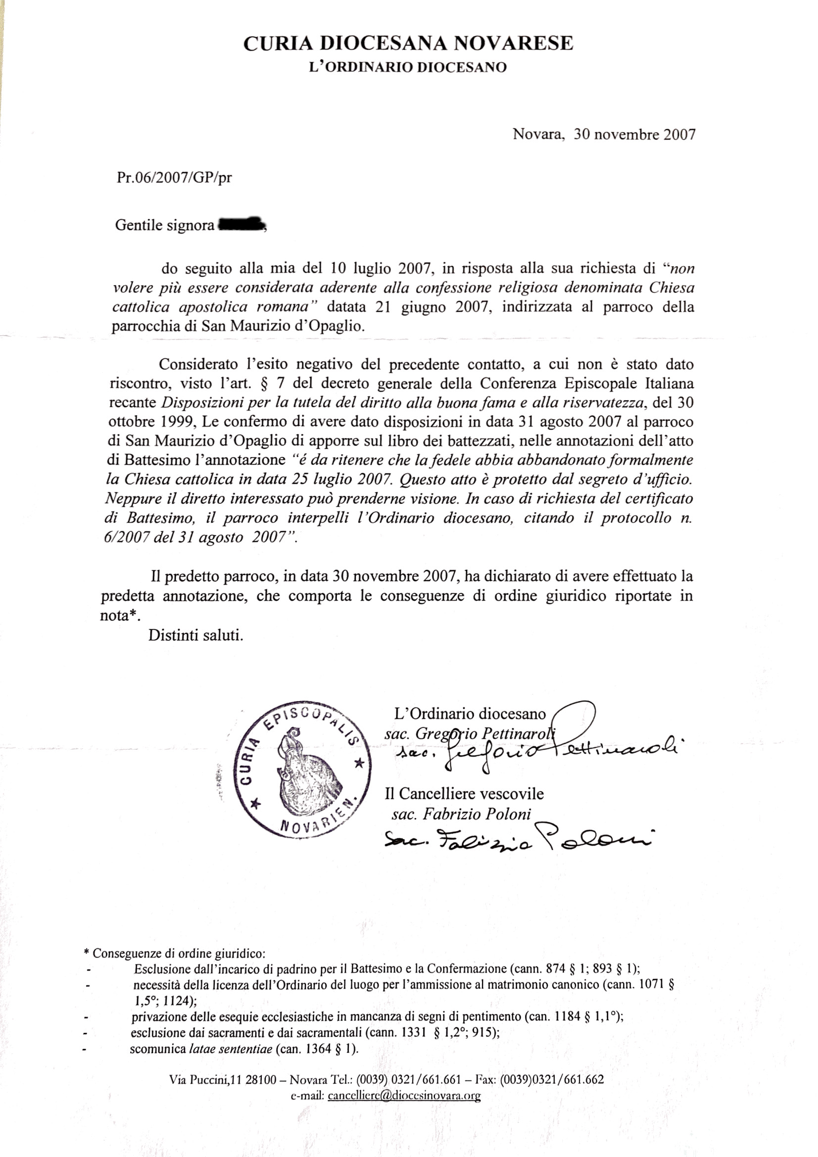 Una persona ha chiesto la rettifica dei dati relativi al proprio battesimo avvenuto a San Maurizio - SAN MAURIZIO D'OPAGLIO (NO) il 30/11/2007, dichiarando di non voler più far parte della Chiesa Cattolica.