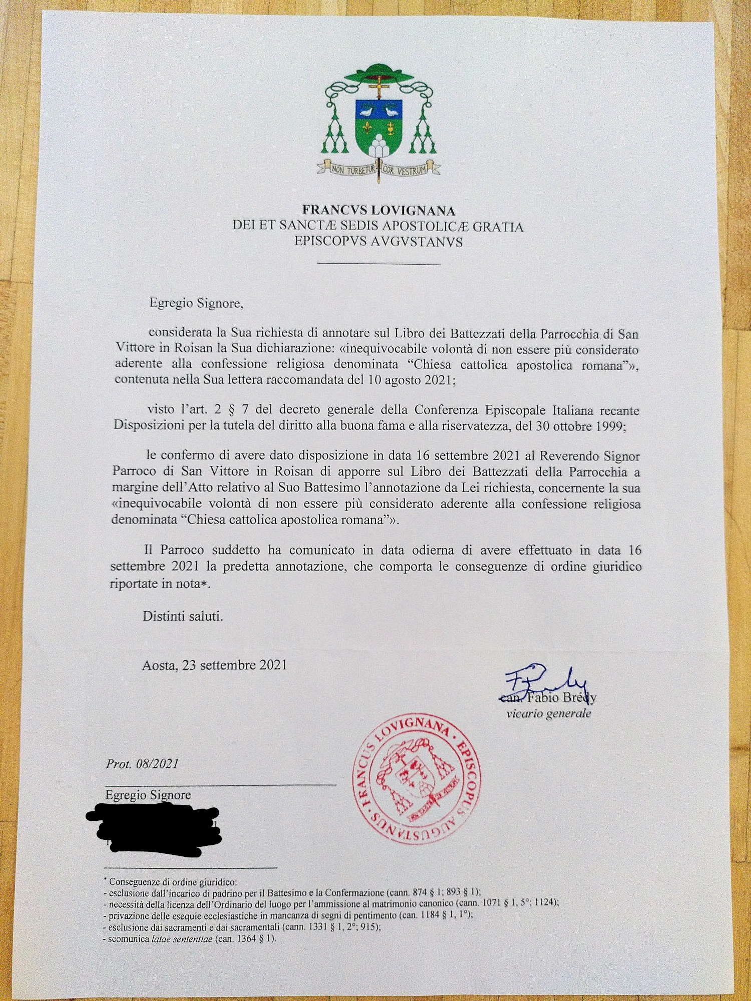 Una persona ha chiesto la rettifica dei dati relativi al proprio battesimo avvenuto a S. Vittore - ROISAN (AO) il 29/09/2021, dichiarando di non voler più far parte della Chiesa Cattolica.