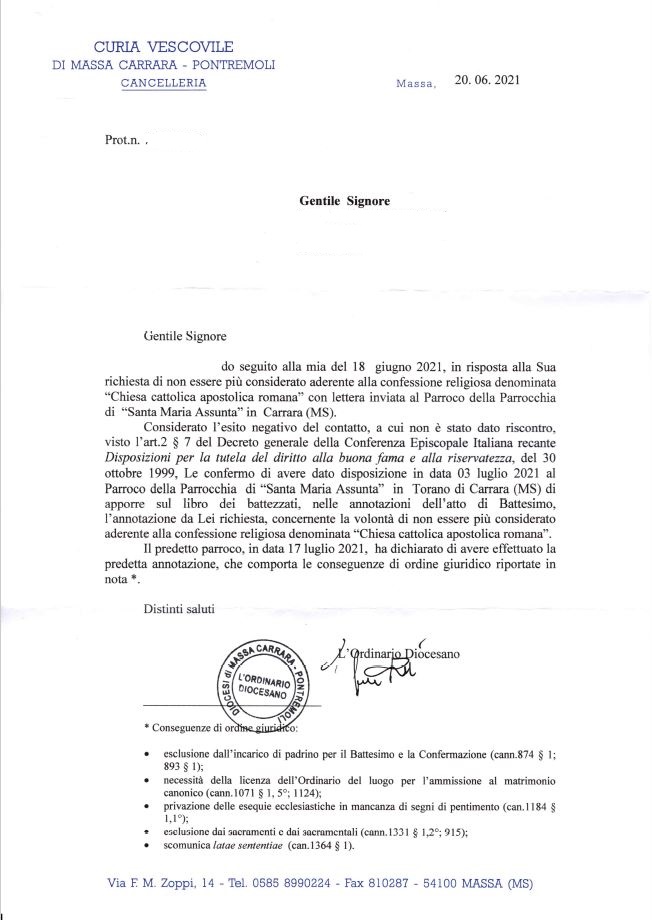 Una persona ha chiesto la rettifica dei dati relativi al proprio battesimo avvenuto a Santa Maria Assunta - TORANO (MS) il 20/08/2021, dichiarando di non voler più far parte della Chiesa Cattolica.