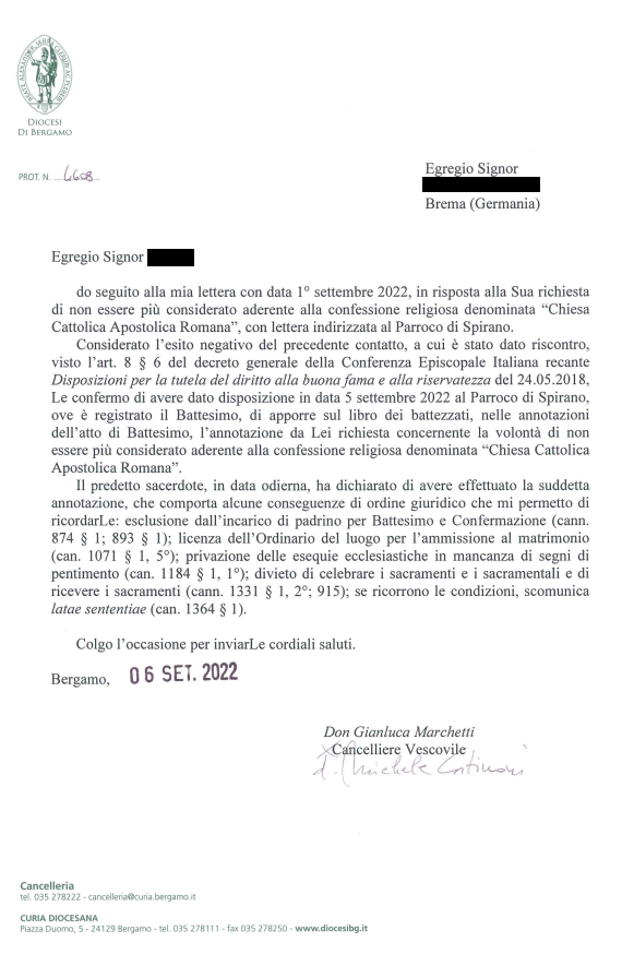Una persona ha chiesto la rettifica dei dati relativi al proprio battesimo avvenuto a Santi Gervasio e Protasio Martiri - SPIRANO (BG) il 06/09/2022, dichiarando di non voler più far parte della Chiesa Cattolica.