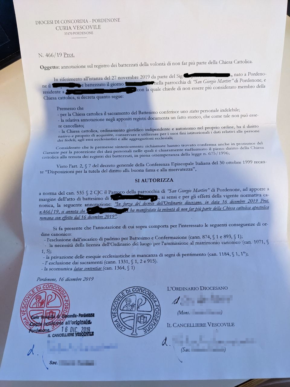 Una persona ha chiesto la rettifica dei dati relativi al proprio battesimo avvenuto a S. Giorgio Martire - PORDENONE (PN) il 16/12/2019, dichiarando di non voler più far parte della Chiesa Cattolica.